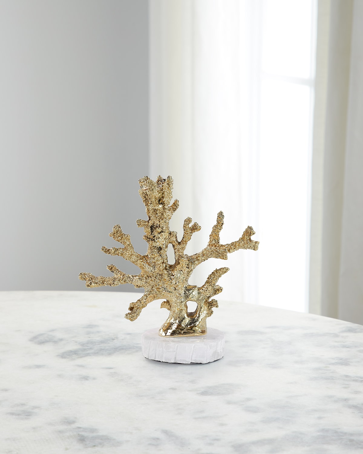 The Brass Coral Candleholder is a gorgeous recreation of one of the ocean's most unique and interesting organisms. Crafted from metal in a brass finish, the piece takes the form of a naturally shaped coral fragment. The coral gracefully sits atop a rounded piece of selenite stone, creating a stunning blend of opulent tones and natural motifs. Approx. 3"L x 10.5"W x 10.8"T Item Weight (Lbs.): 6.5 Wipe clean Imported