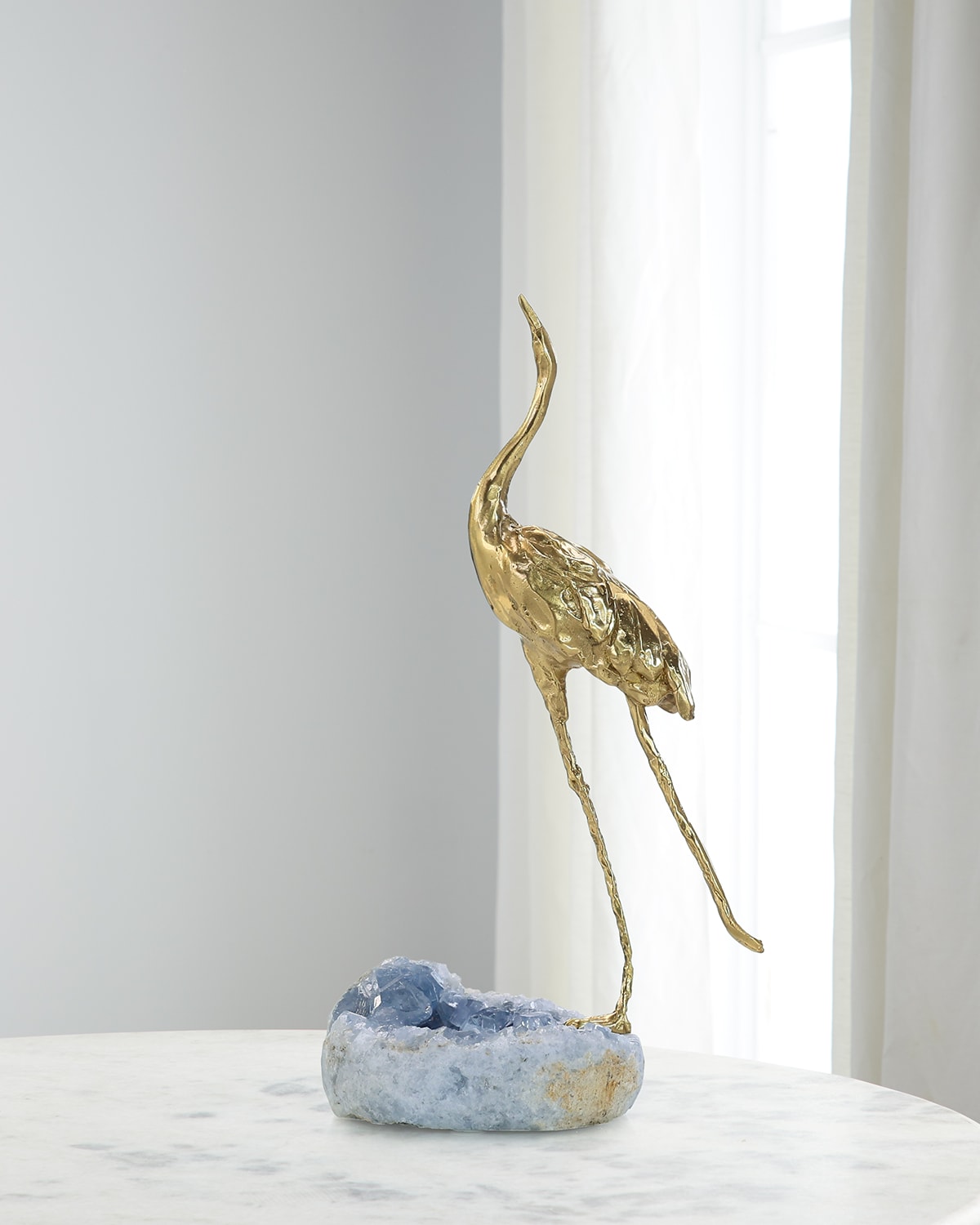 This gorgeous sculpture depicts one of mother nature's majestic creations in stunning detail. Crafted from brass, the piece takes the form of a beautiful crane in an outstretched position as it stands atop a base of natural kyanite stone. Handcrafted of brass and stone Approx. 3"L x 4.8"W Includes hanging hardware Item Weight (Lbs.): 2.0 Wipe clean Imported