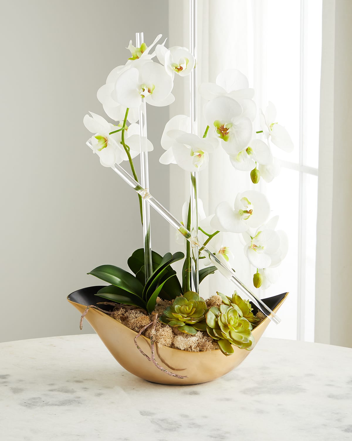 EXCLUSIVELY OURS. White Phalaenopsis orchids stand tall as they are surrounded by succulents in the gold finished aluminum container. Handcrafted of polyester and aluminum. Overall: 17"W x 10"D x 28"T. Base: 16"W x 8"D x 6"T. Feather dust. Made in the USA of imported materials.