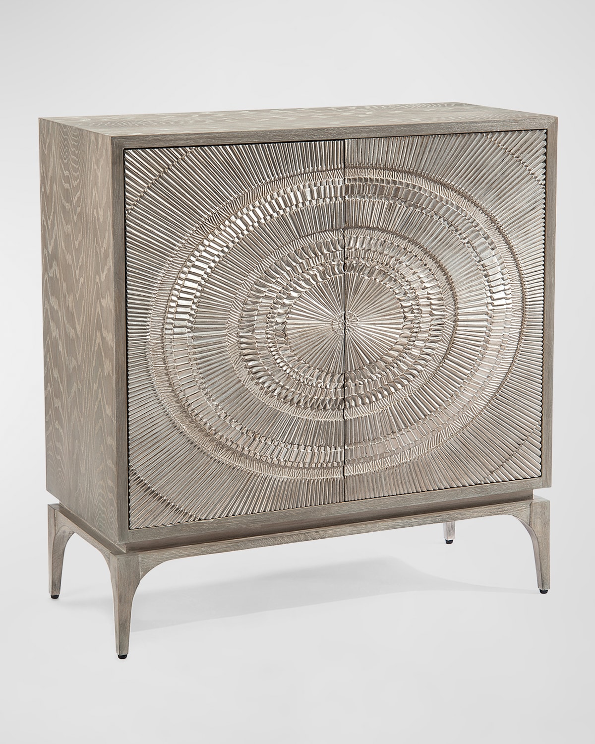 This beautiful twodoor cabinet features doors with a pattern radiating out from the center. Crafted of oak wood, bioresin, and wood composite Overall, approx. 41.75"W x 18.25"D x 43"T Includes hardware Weight, 153.0 lbs Imported Boxed weight, approximately 202.0 lbs