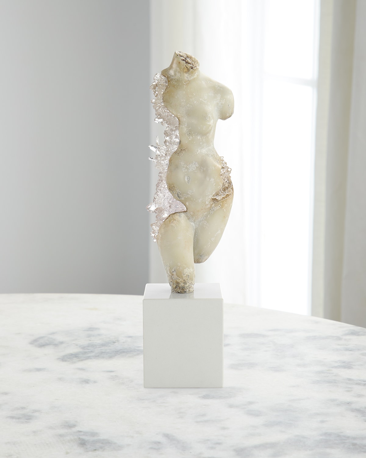The crystal maiden sculpture is a stunning, majestic statement piece that commands attention within a space. The piece depicts an elegant blend of motifs as a detailed female torso is overtaken by gorgeous crystal formations. The sculpture proudly stands atop a rectangular base of white marble, complementing the neutral color palette. Handcrafted of metal, marble and polyresin Approx. 26.5"H X 7"W X 7.5"D Wipe clean Imported Weight, 21.5lbs Boxed weight, approximately 24.0lbs