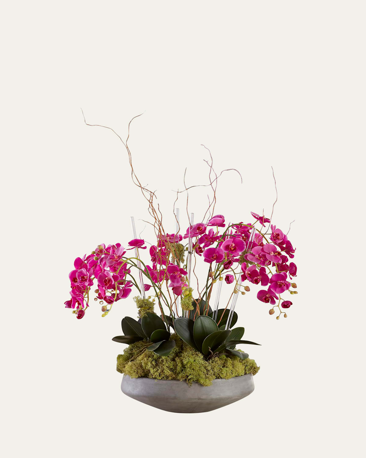 Exclusively ours. Handcrafted faux orchid arrangement in concrete bowl. Curly willow wood, acrylic rods, and moss details. Polyester stems. Overall: 35"Dia. x 44"T. Base: 17.5"Dia. x 6"T. Made in the USA of imported materials.