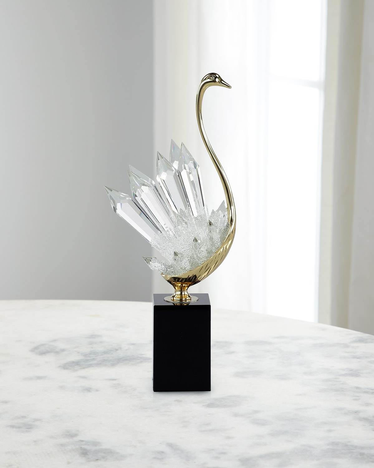 The crystalline bird sculpture is a stunning accent piece that takes inspiration from mother nature's majestic creations. An elegant brass bird with a long, winding neck showcases stunning plumage crafted from faceted crystals. The bird is gently perched atop a squared base of black crystal, providing playful juxtaposition to the opulent tones of the body. Handcrafted of brass and crystals Approx. 20"L x 20.0"W Includes hanging hardware Item Weight (Lbs.): 5.0 Wipe clean Imported