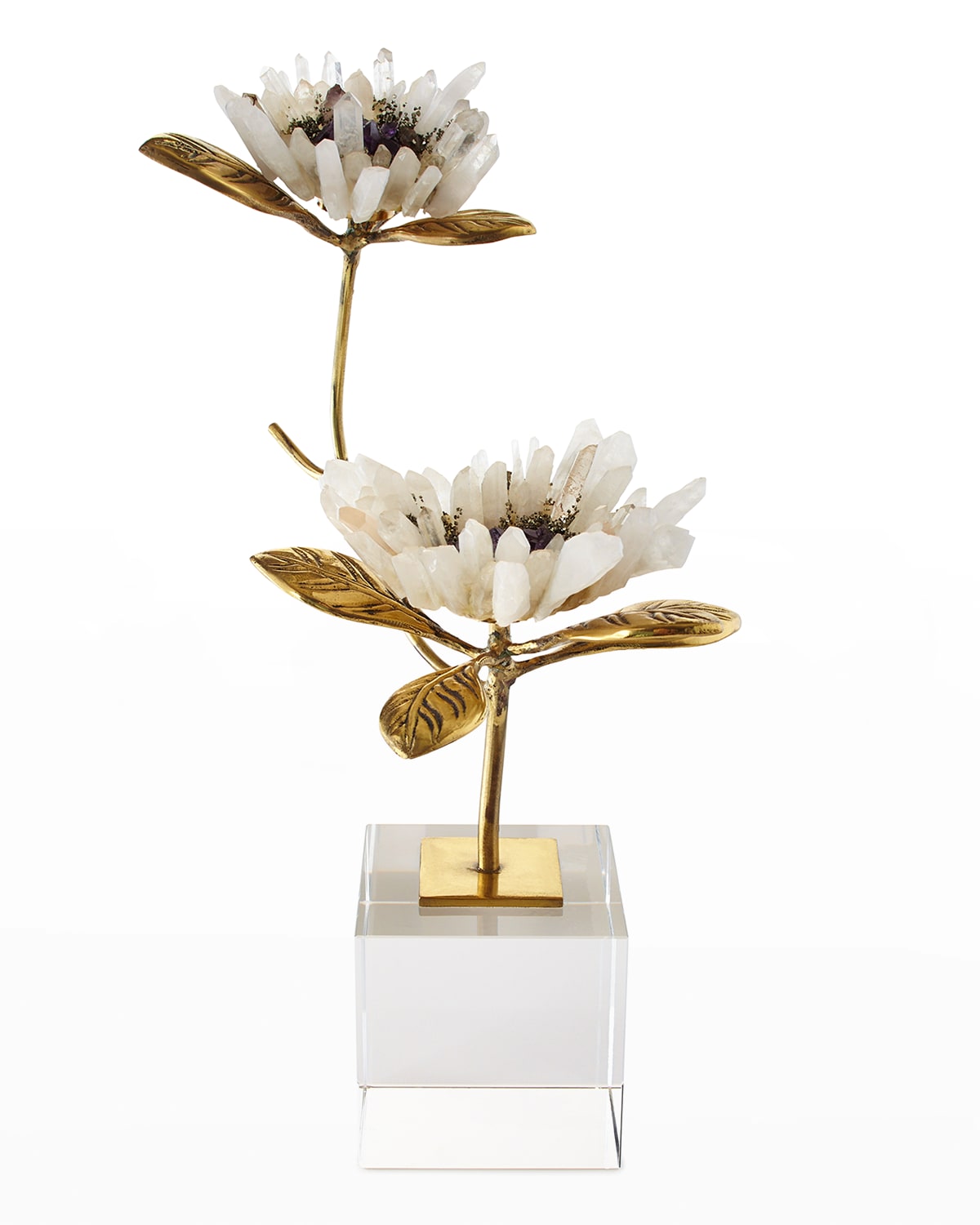 Handcrafted floral sculpture. Double crystal quartz bloom. Pyrite and amethyst center. Castbrass stems. Set on a crystal base. 8"W x 6"D x 11.5"T. Imported.