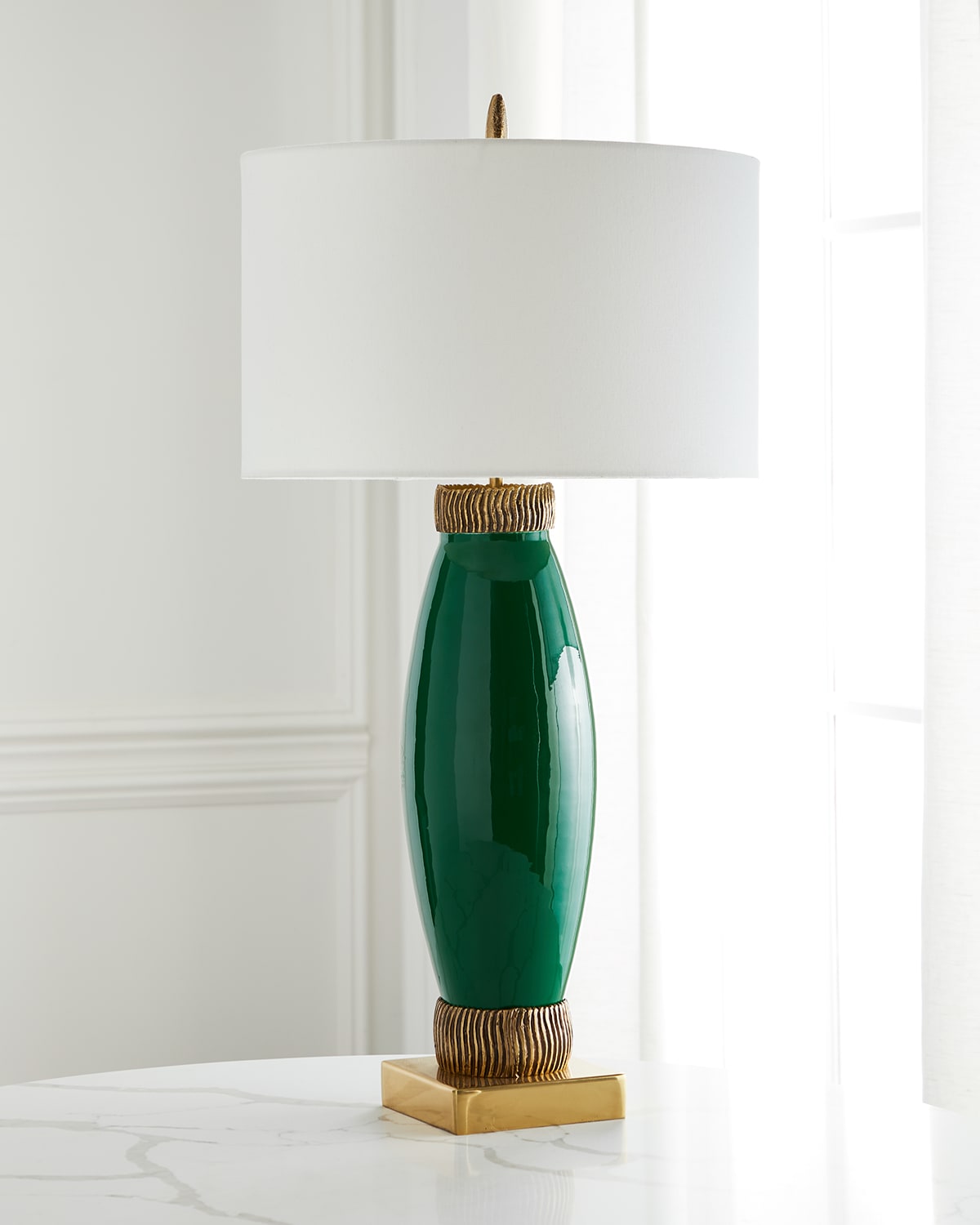 The Emerald Aurelian Lamp features a stunning body of green glass with alluring curvature, held in place by gorgeous bands of brass in an antiqued finish. The bands, featuring intricate textural detail, provide the piece with a dignified look that imbues an interior space with an air of gravitas. The piece gently rests atop a square brass base with a polished finish that matches the finial, playfully contrasting the darker metallic tones of this stunning turnkey lamp. Handcrafted of brass and glass with a cotton, polyester, and rayon shade Uses one 150watt type a bulb Approx. 18"Dia x 37.5"T Lampshade Dimensions: 18"Dia x 11"T Cord length: 6 ft. UL listed Sold individually Wipe clean Imported Weight, 11.5 lbs Boxed weight, approximately 36.4 lbs