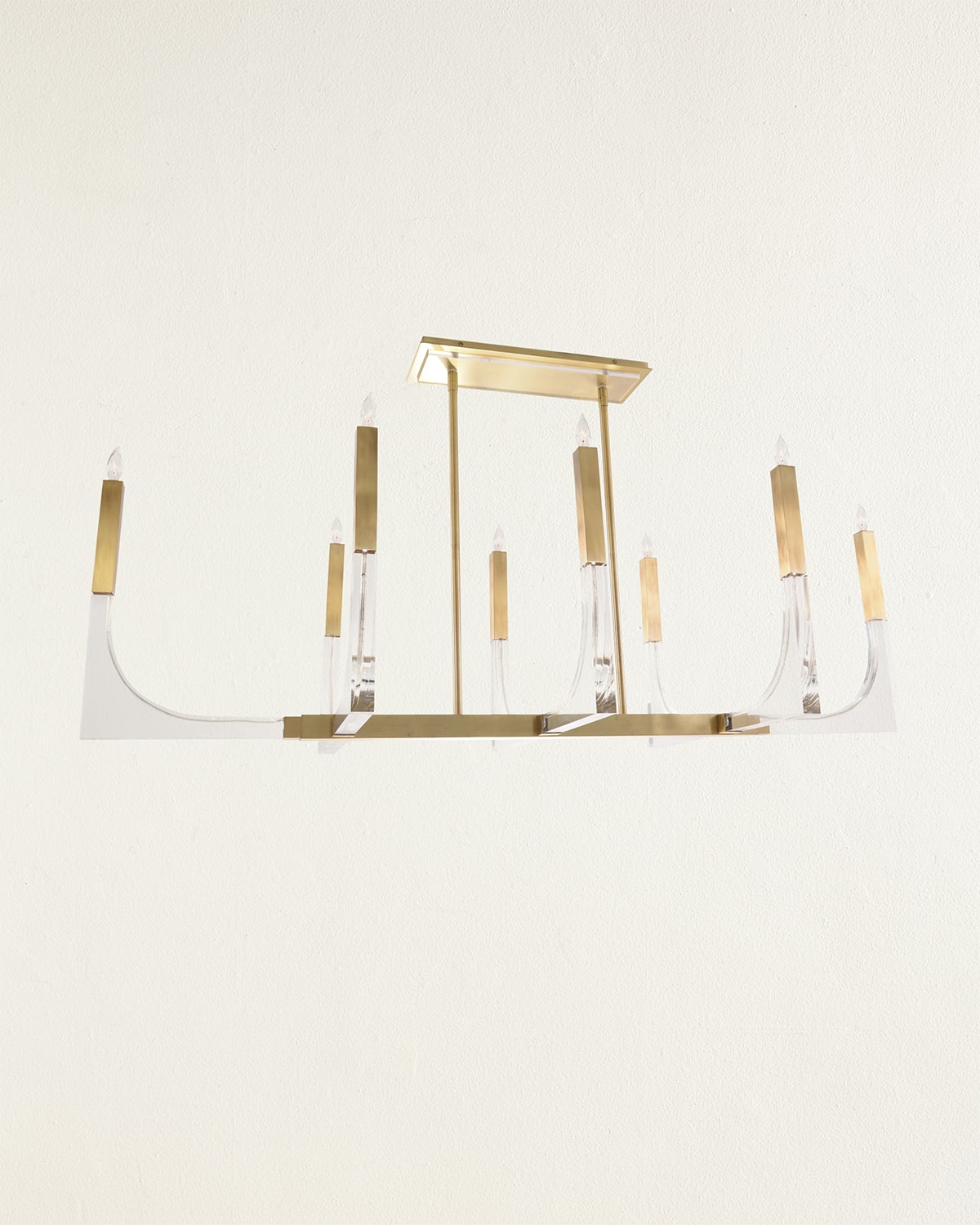 This horizontal chandelier in acrylic has eight lights and a polished nickel finish. Overall: 58"W x 24"D x 28"T. Maximum overall hang height: 64"T. Canopy: 18"W x 6.25"D x 1"T. Includes two sets of 6" down rods and two sets of 12" down rods. Uses eight candelabra, 60watt, typeB bulbs (not included). Adjustable. Imported. Boxed weight, approximately 55 lbs.