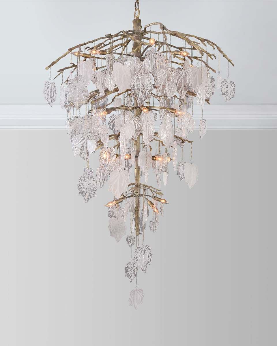 Magnificent glass sugar leaves drip from organic branches on this twentysixlight chandelier in a brushed brass finish. Handcrafted of iron, brass, and glass. Maximum hang height: 174"T; adjustable. Overall: 44"Dia. x 72"T. Uses 26 candelabra base, typeB 40watt bulbs. 8 ft. chain; 10 ft. cord. Canopy: 7"Dia. UL listed. Assembly required. Feather dust. Imported. Boxed weight, approximately 148 lbs.