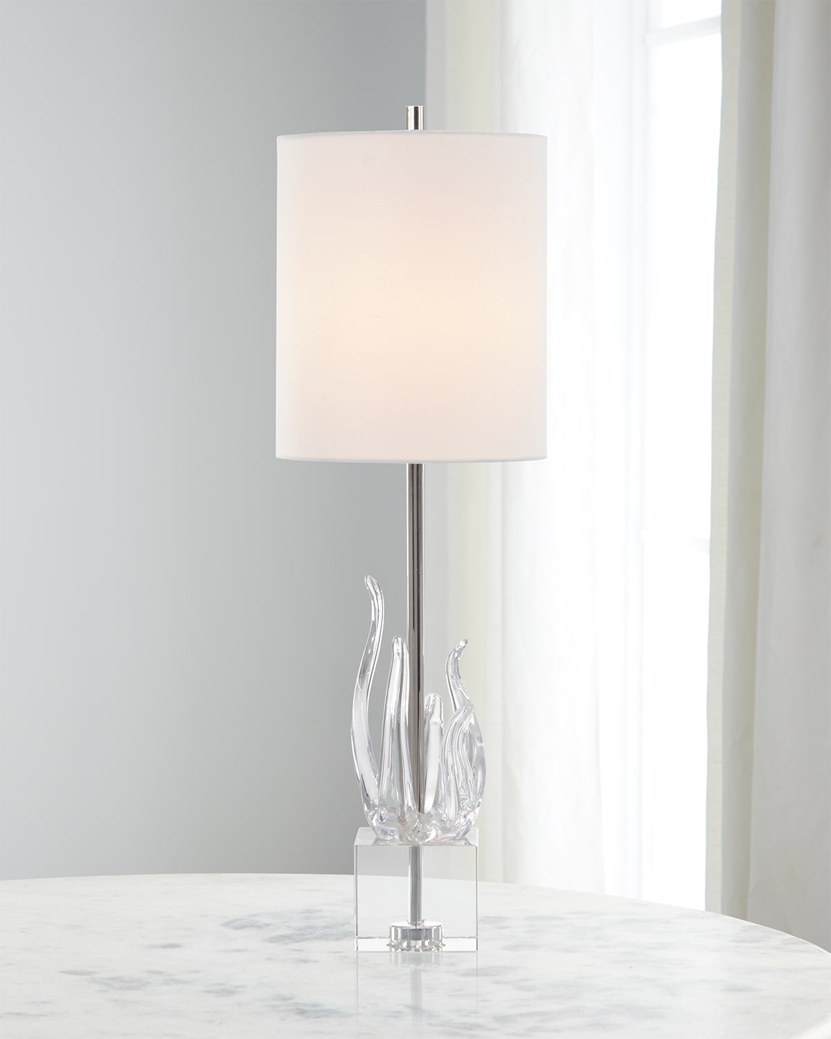 Glass sculpture table lamp, features a freeform glass sculpture atop a crystal base. Handcrafted of crystal and iron. Disclaimer: With glass, variations in size, shape, and color may occur. Overall: 10"Dia. x 31"T. Shade: 10"Dia. x 12"T. Center rod: 0.75"Dia. x 14.5"T. Base: 4.5"Sq. x 4"T. Uses one 150watt, typeA bulb. 10" nickel harp, turnkey. 3way switch. UL Listed. Imported. Boxed weight, approximately 14 lbs.