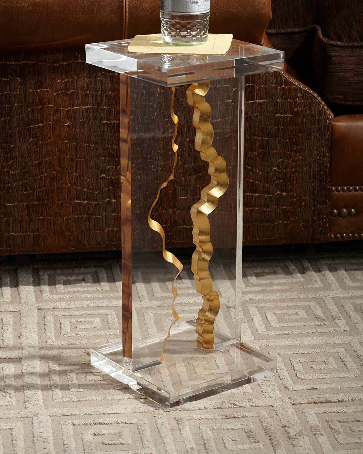 Acrylic divided landscape martini table edged in gold leaf. Approx. 9"D x 9"W x 22"T. Imported. Boxed weight, approximately 18 lbs.