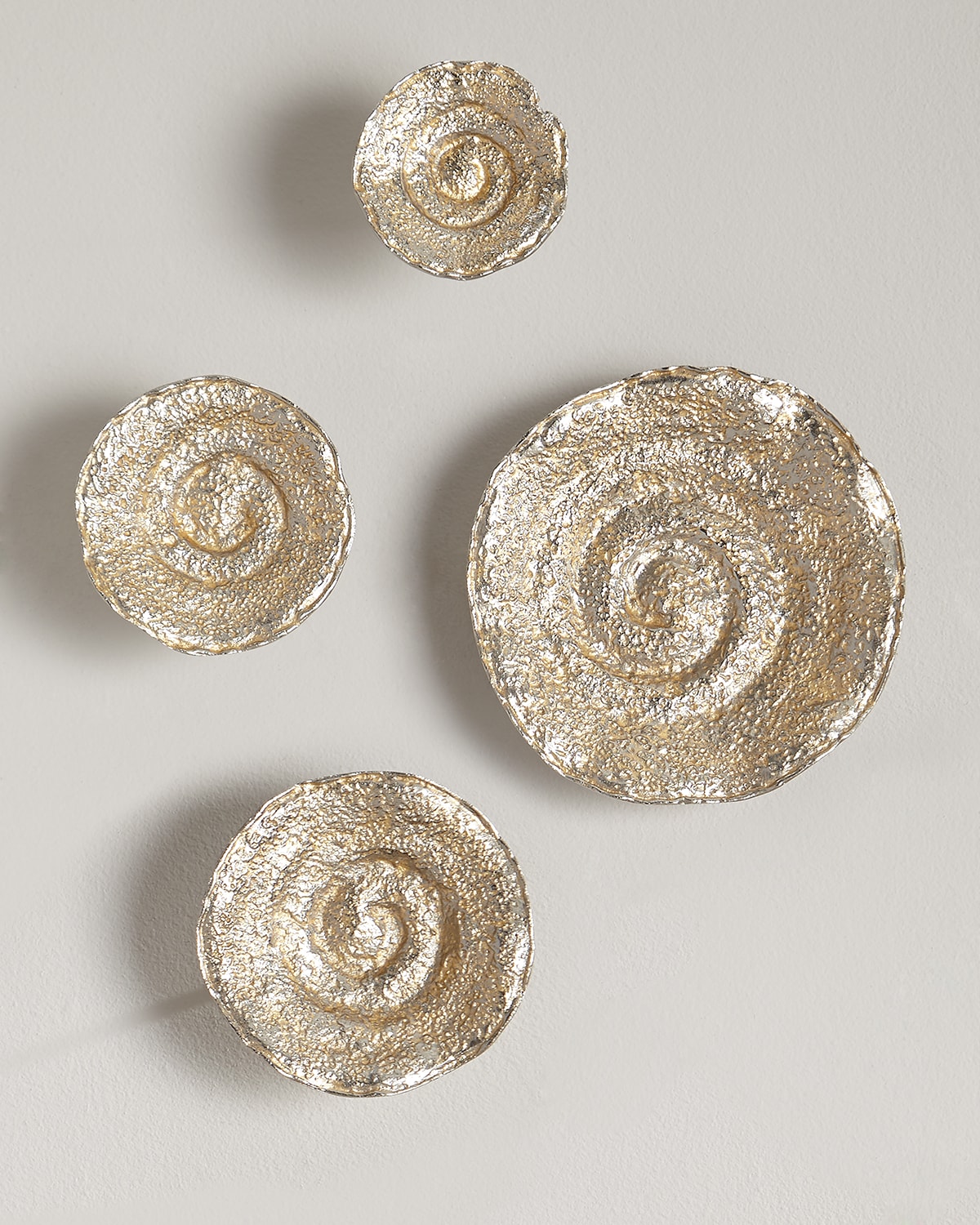Escargot wall hangings with gold leaf and nickel finish. Set of 4 includes 1 each of assorted diameters ranging from 6.510.5" as shown. Made of intricately textured aluminum. Hanging brackets included. Imported. Boxed weight, approximately 9 lbs.