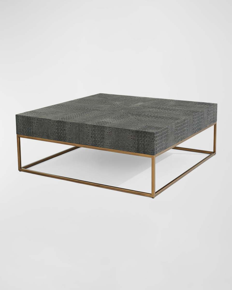 The Greystoke Cocktail Table features a top with faux crocodile hide (resin) in Greystoke Black and a metal base in an Aztec Gold finish. Handcrafted of engineered hardwood, veneers, wood composite, and metal Overall, approx. 48"Sq. x 18"T Includes hardware Finished back Weight, 152.0 lbs Imported Boxed weight, approximately 217.8 lbs
