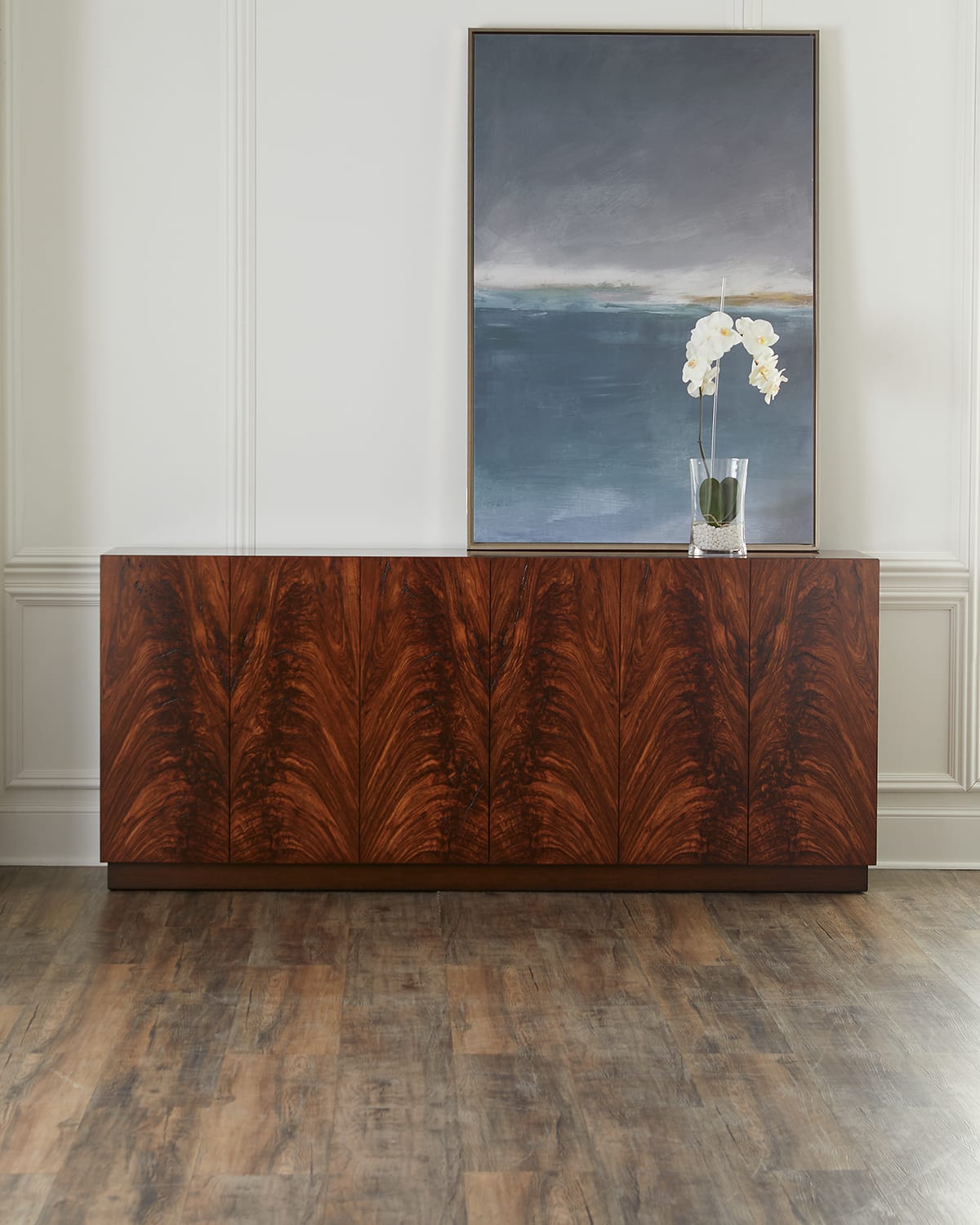 The natural distressed finish of the Grovecroft SixDoor Credenza is due to the unique nature of Zebraki wood. With its beautiful textured pattern, this piece is a refinement of a new traditional favorite. This case sits on a plinth base of juniper walnut and each door is finished with soft closing hinges. Handcrafted of engineered hardwood, veneers, and wood composite Overall, approx. 88"W x 19.25"D x 38"T Includes hardware Weight, 296.0 lbs Imported Boxed weight, approximately 371.0 lbs