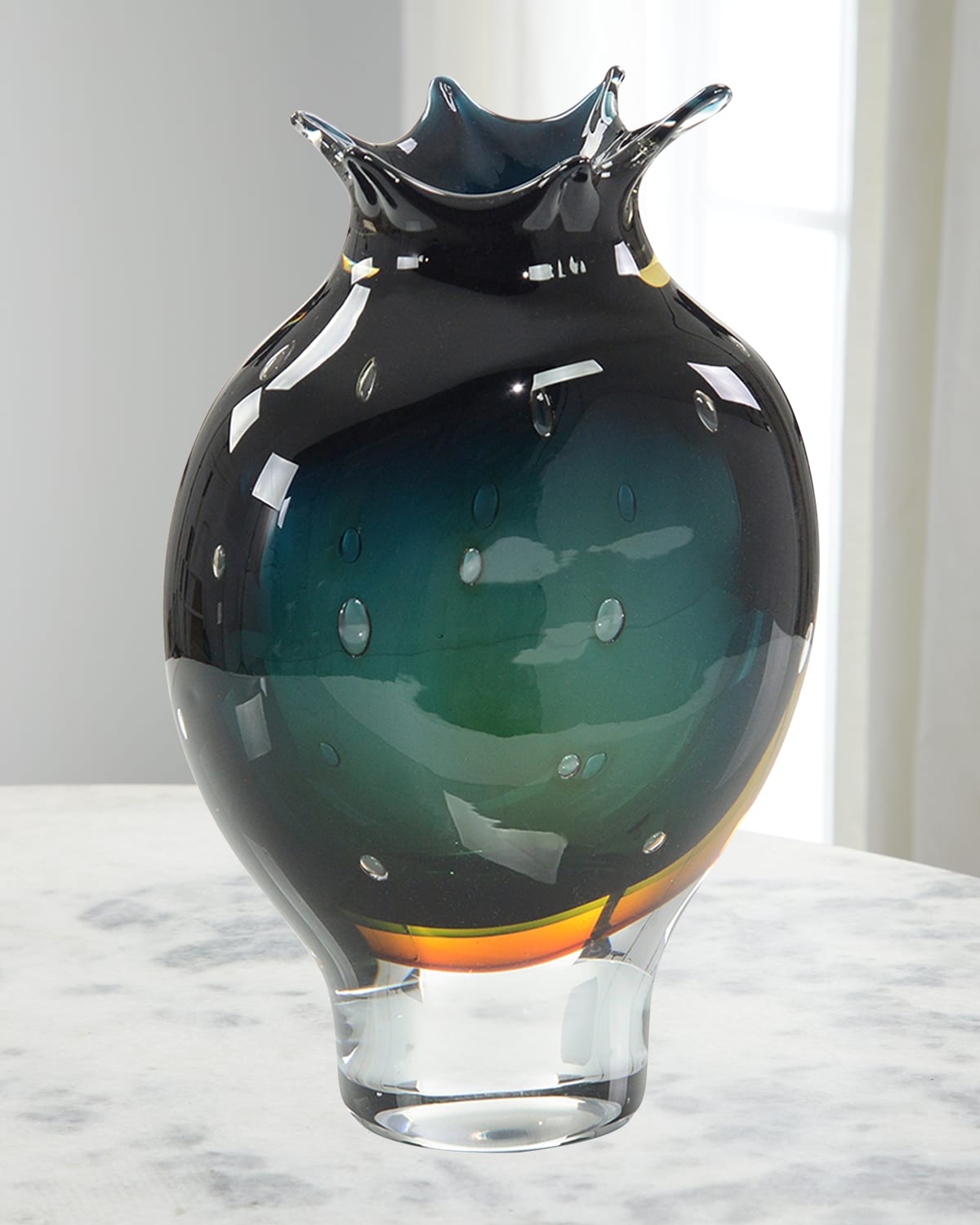 This handblown dark blue and amber glass vase with curved edges adds a stunning pop of color to your home décor. Approx. 3.8"L x 8"W x 12.5"T Sold individually Item Weight (Lbs.): 11.6 Wipe clean Imported