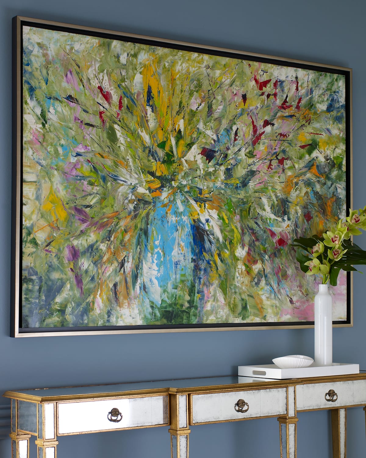 Hand painted oil on canvas signed by the artist. Because each painting is created individually, colors will vary. 69"W x 2"D x 50"T. Distressed wooden frame has a brushed pewter finish. Mounting hardware included. Imported. Weight, 45 lbs. Boxed weight, approximately 52 lbs.