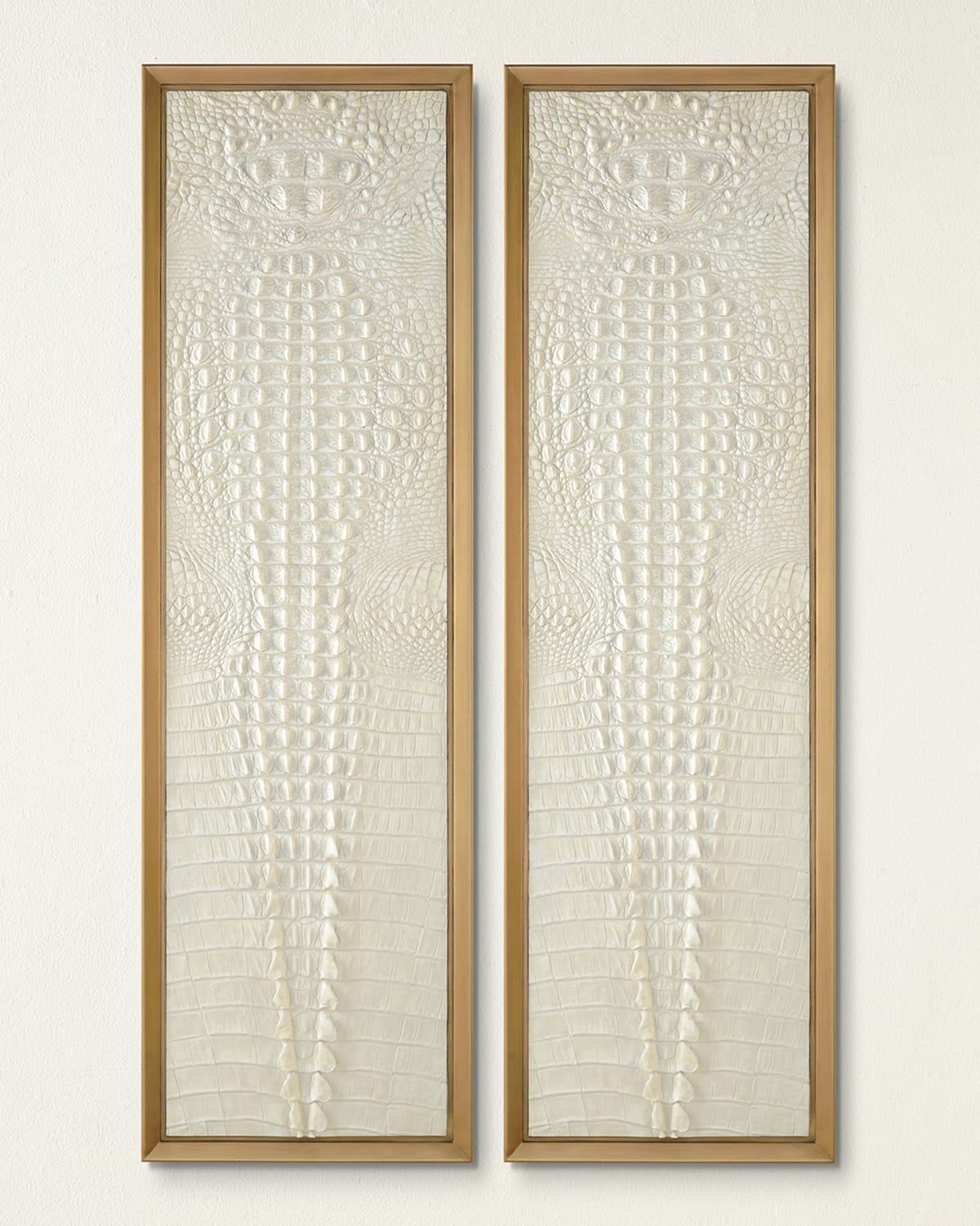 This matching pair of wall panels features fullhide faux crocodile skin. They are finished in variegated cream and white. Chamfered frames in brushed brass surround each panel. These panels are designed for portrait or landscape orientation. Handcrafted of wood composite, beech solids, celtis veneer, and resin. Twopiece set. Approx. 24"W x 2"D x 80"T. French cleats are fitted for hanging. Feather dust. Imported. Boxed weight, approximately 133 lbs.