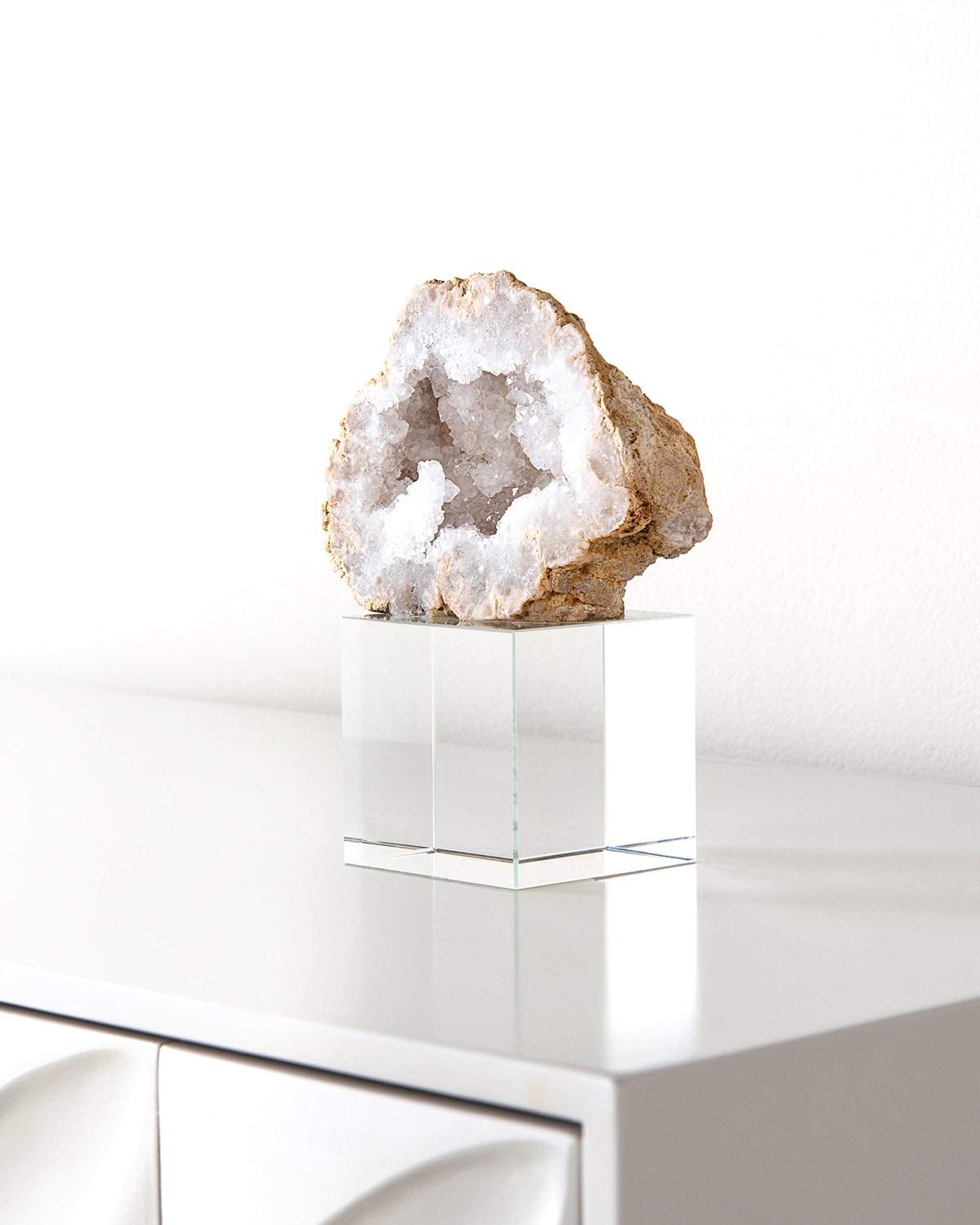 Handcrafted natural geode on optical crystal base. Size, shape and color of geode will vary. 6"W x 3"D x 7.5"T. Imported.