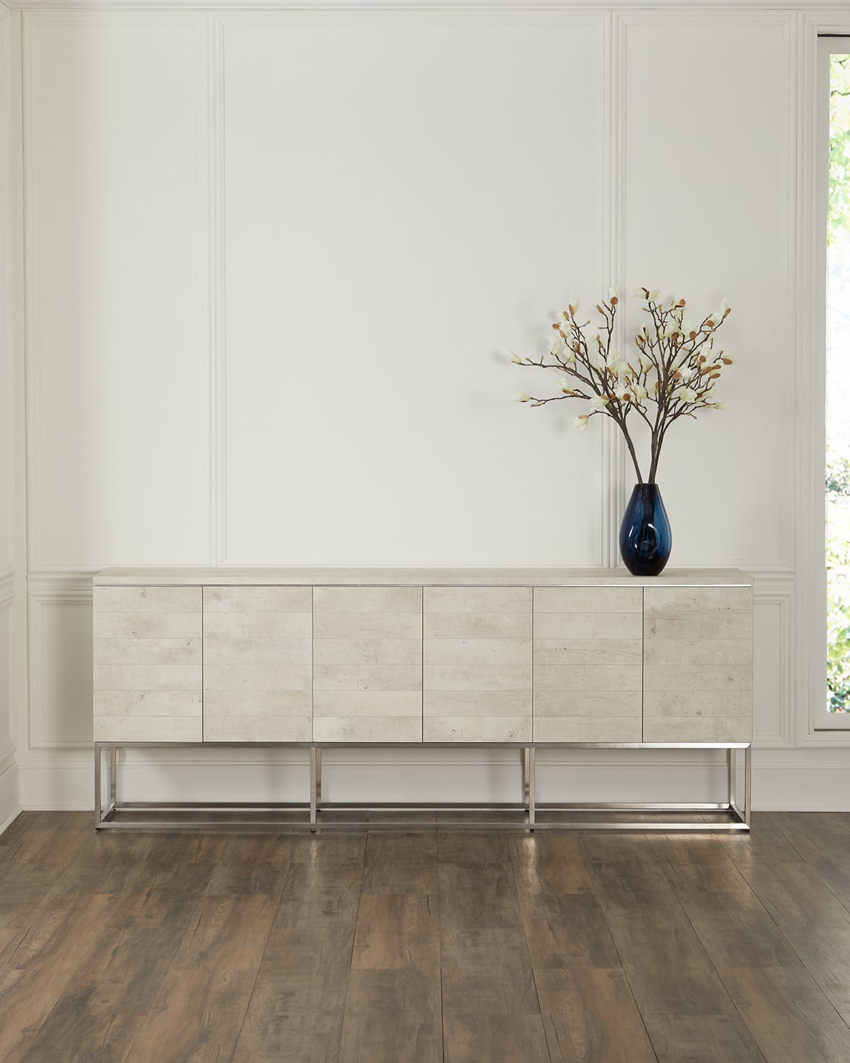 Fully encased in a Tiza Gesso finish, this sixdoor sideboard sits on a brushed stainless steel base. Handcrafted of engineered hardwood, beech wood, and steel Overall, approx. 94"W x 18"D x 36.5"T Includes hardware Weight, 291.0 lbs Imported Boxed weight, approximately 378.0 lbs