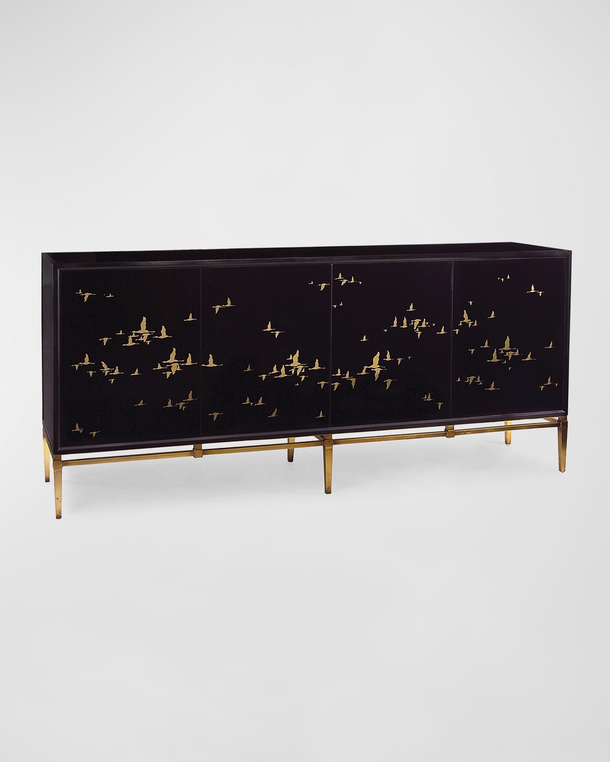 Named the Migration FourDoor Credenza, this beautiful piece showcases migrating birds that are reverse handpainted in gold on black glass. The cabinet has a black glass top and sides and is mounted on 6 metal legs finished in Old Gold. Handcrafted of poplar wood and steel Four doors with autolatches Overall, approx. 88"W x 19"D x 38.5"T Light assembly required to insert adjustable shelves Weight, 295.5 lbs Imported Boxed weight, approximately 401.0 lbs