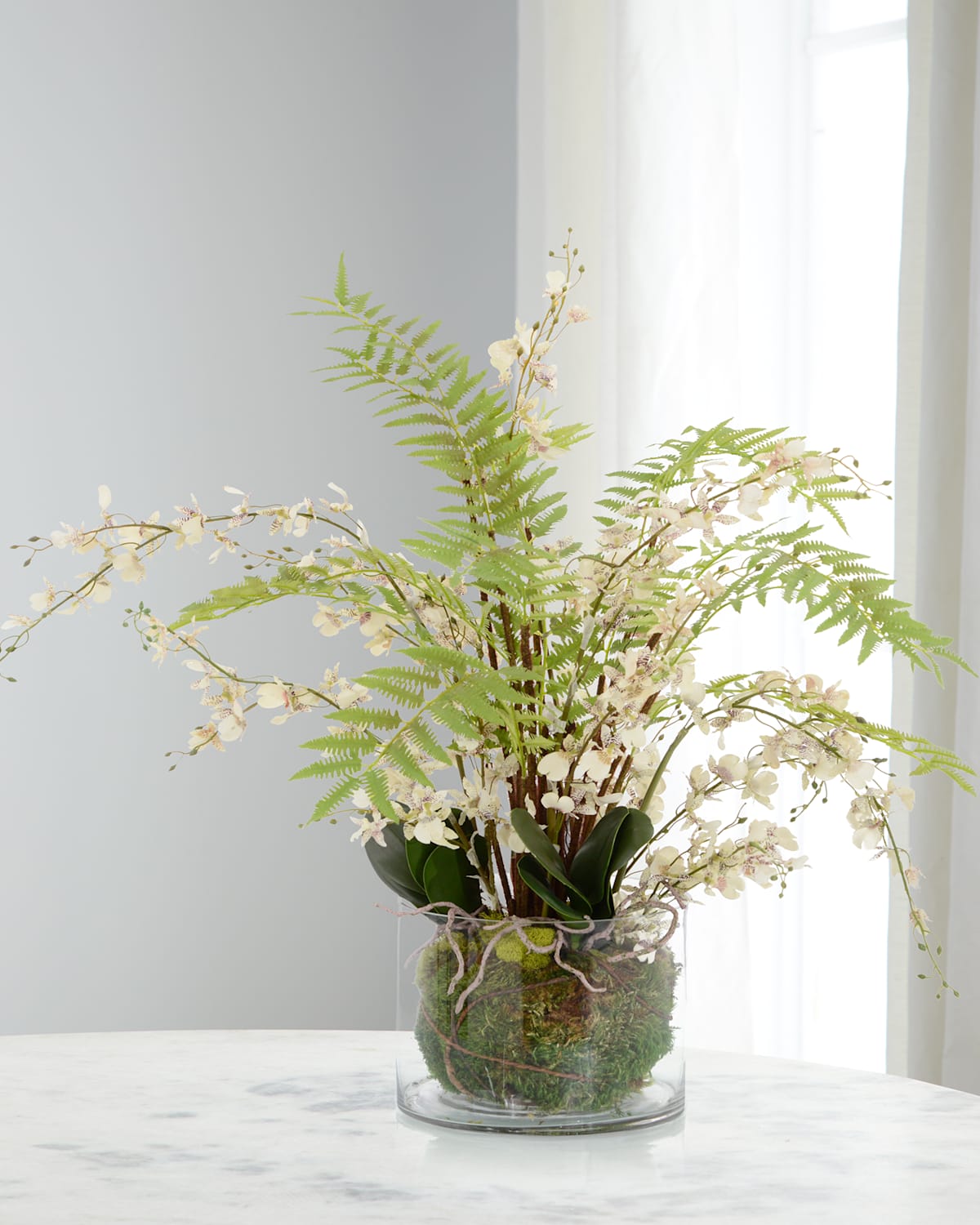 Orchids and ferns mixed together and potted in a clear glass cylinder, which highlights a vibrant moss ball Handcrafted of polyblend and glass Vase, approx. 8"T x 8"D Overall, approx. 27"L x 34"W x 32"T Wipe clean Made in USA