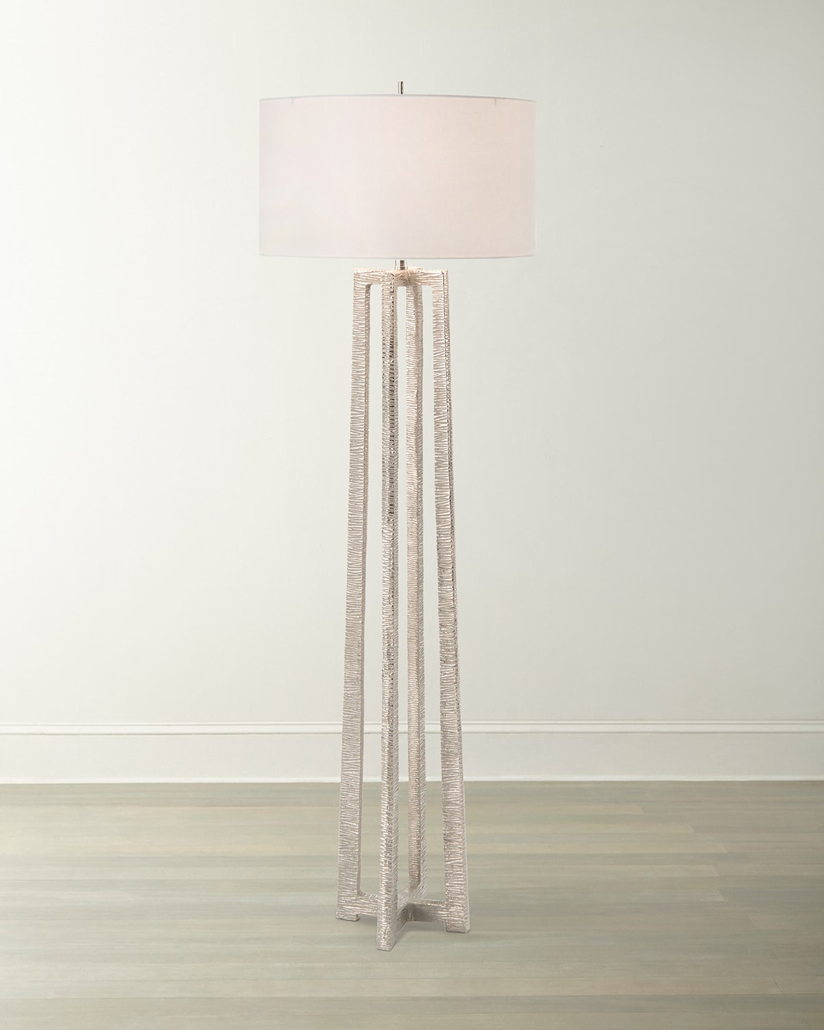 Handcrafted floor lamp. Textured nickel plated aluminum four column base. Manmade linen shade with cotton inside. Shade dimensions: 20"Dia. x 11"T. Uses one typeA 150watt bulb. Overall: 20"Dia. x 64"T. Cord length: 10 ft. Imported. Boxed weight, approximately 50 lbs.