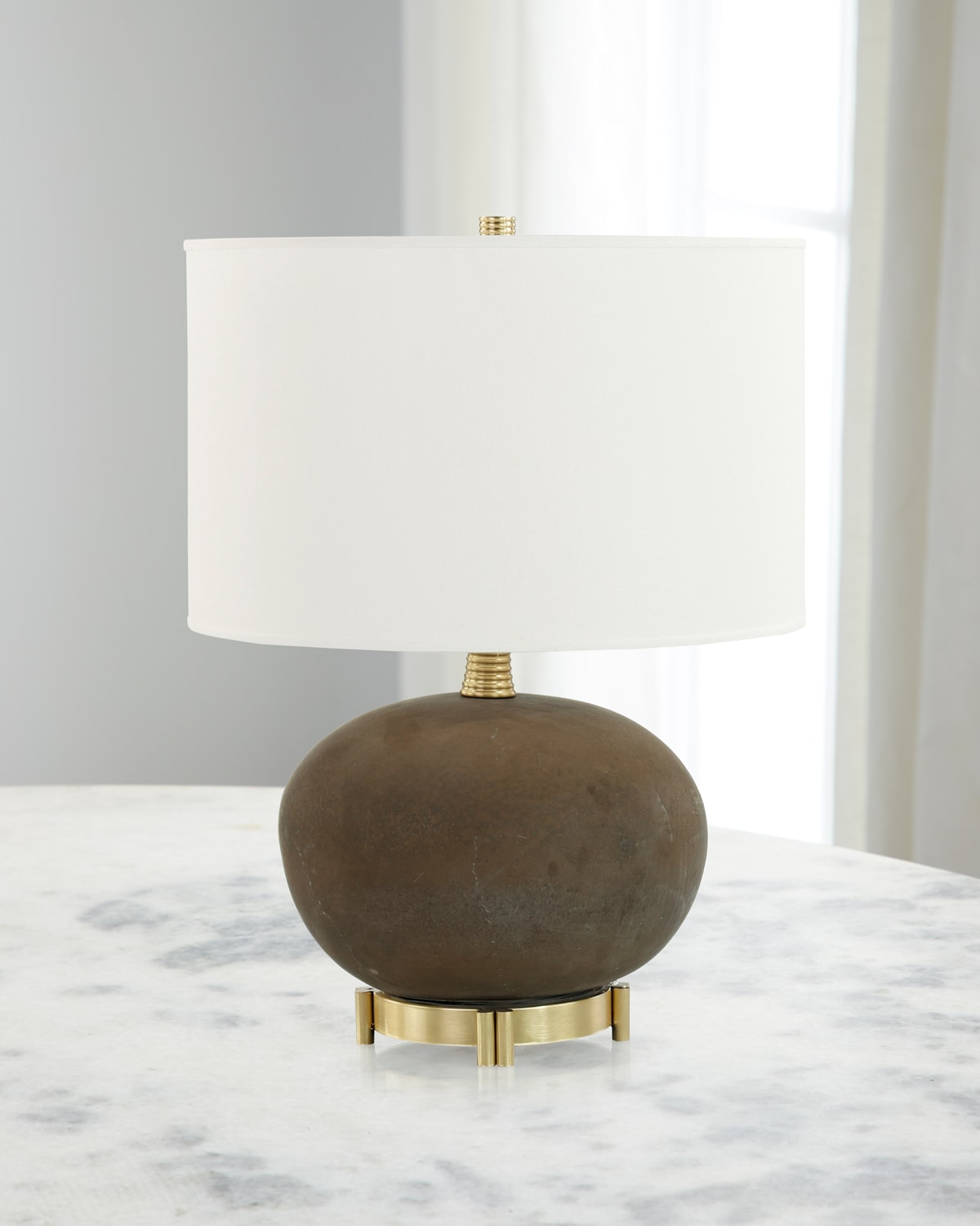 The nomad table lamp is a stunning piece that elevates rich earthen tones with opulent metal accents. Crafted from porcelain with a rich brown tone, the piece features a coiled brass accent that matches the finial above. A rounded brass base features four pairs of slender rods, completing the look of this threeway turnkey lamp. Includes hanging hardware Cord length: 6 ft. UL listed Threeway switch Uses one typeA 150watt bulb (E26 medium) Assembly required Lampshade dimensions: 16" x16" x10" Overall, approx. 16"W x 16"D x 22"T Wipe clean Imported Weight, 17.0lbs Boxed weight, approx. 22.0 lbs