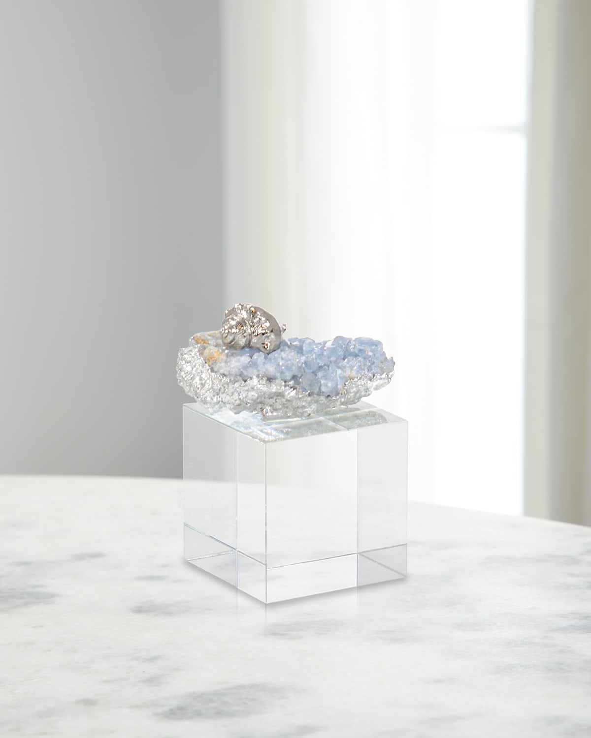 A celebration of the ocean's natural beauty, the Ocean Floor Sculpture on Crystal Base features a rugged blue stone that nests within a bed of brass in a nickel finish. A small seashell rests gently on top of the stone, with a large block of clear acrylic introducing transparent hues and smooth lines to the organically shaped piece. Handcrafted of leadfree crystal, quartz, and brass Approx. 5"T x 3.25"L x 3.25"W Item Weight: 4.0 lbs. Wipe clean Imported Boxed weight, approximately 4.5 lbs.