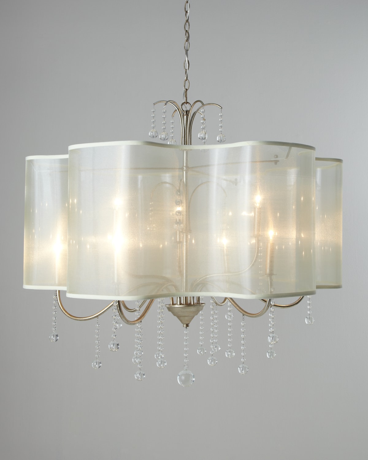 Chandelier features a veiled quatrefoil drum shade and glass ball pendants. Handcrafted of iron, metal, and glass. Antiqued Parisiansilver finish. Sheer silk shade. Ceiling canopy included. Direct wire; professional installation required. Uses nine 60watt bulbs. 40"W x 40"D x 36"T with 10'L chain. Imported. Boxed weight, approximately 52 lbs.