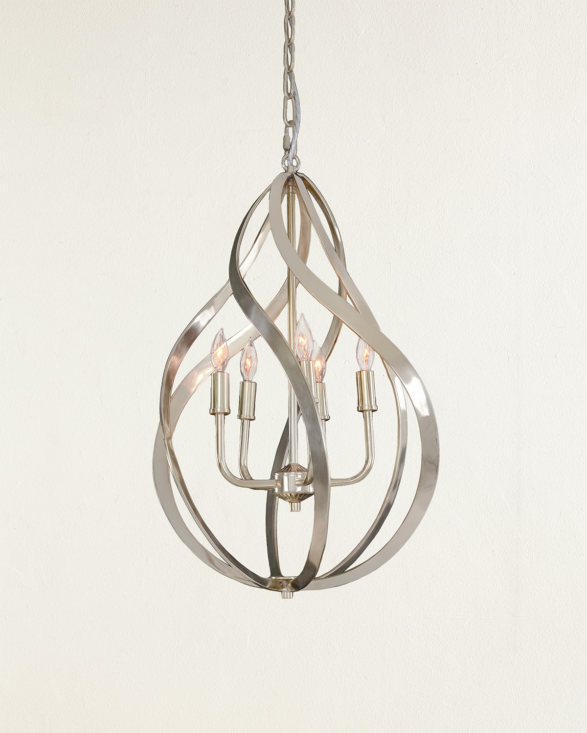 This optical sculpture of swirling ribbons in nickel features some turns for a multidimensional display. Made of iron and brass. Approx. 17"Dia. x 25"T. Uses five candelabra, 60watt, typeB bulbs (not included). Maximum Overall Hang Height: 140"T. Canopy: 4.5"; chain: 10' adjustable (included). Adjustable. Wipe clean. Imported. Boxed weight, approximately 26.5 lbs.