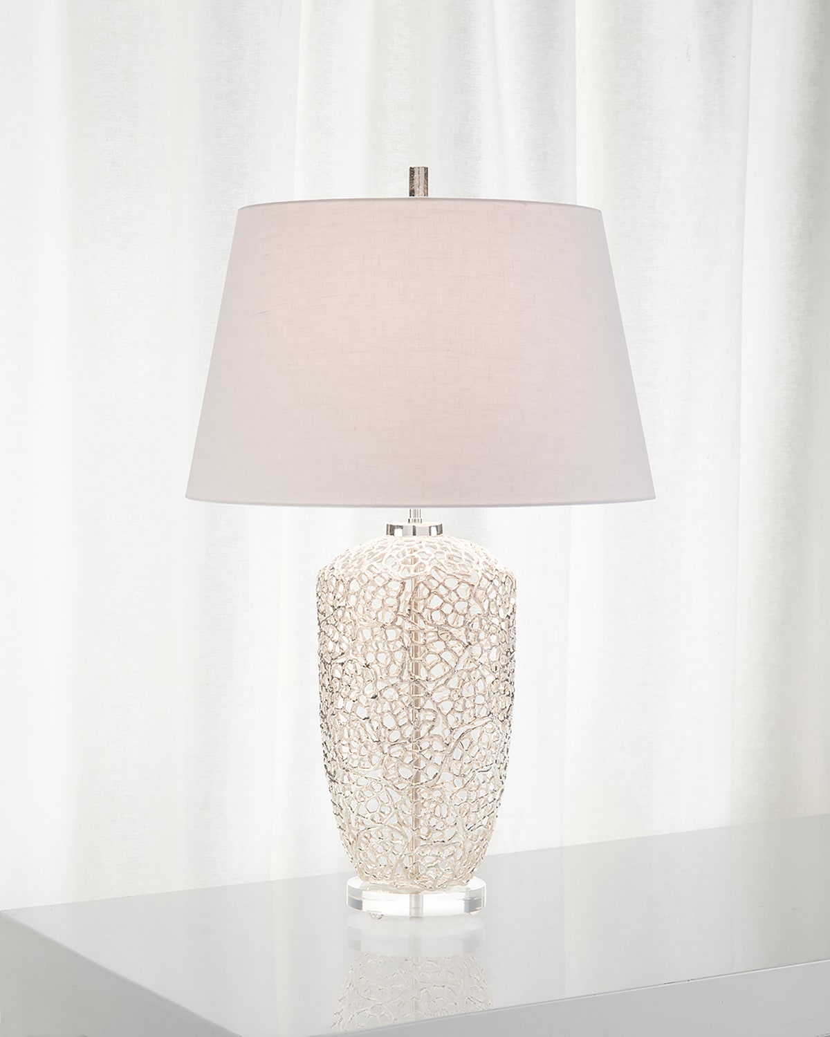 Nickelplated brass table lamp with acrylic base. White fabric shade. Uses one 150watt bulb. 19.5"Dia. x 31.5"T. Imported.