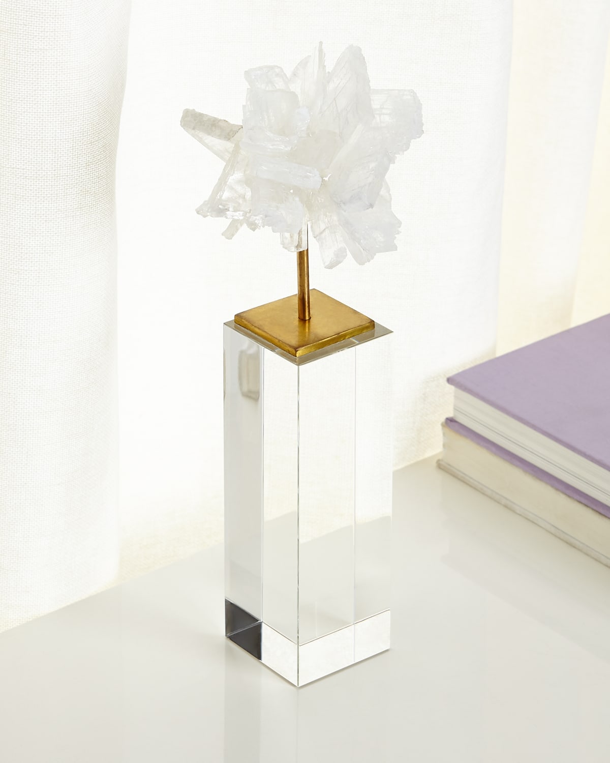 Flower sculpture. 5"Sq. x 13"T. Blossom formed of shards of cellophane selenite; brass stem. Mounted on crystal base. Imported.