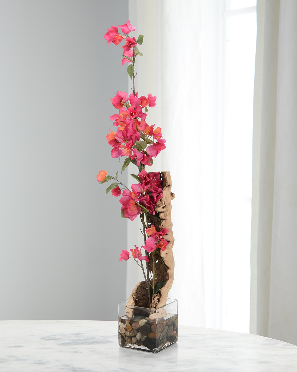 Tropical bougainvillea stands tall in a cylinder vase set with river rock and acrylic water Handcrafted of ProViscose® rayon, polypropylene, and glass Approx. 11"W x 42"T Item Weight (Lbs.): 12.0 Wipe clean Made in USA from imported materials