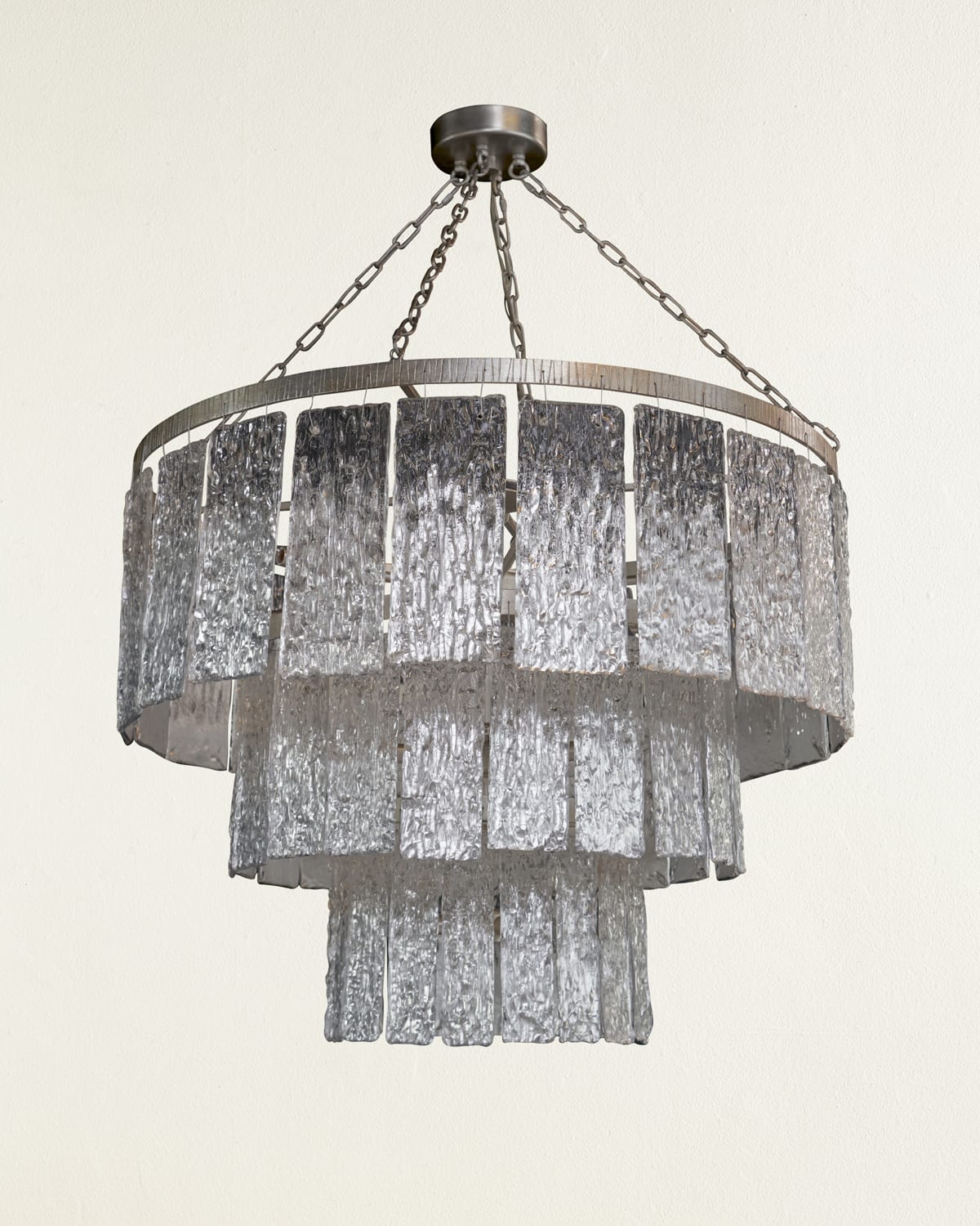 Handcrafted, threetiered slumped glass panel chandelier with gold leaf gradations. Uses 16 typeB 60watt candelabra bulbs. Canopy: 6"Dia. Iron and glass. Overall: 35.5"Dia. x 29.5"T. Cord length: 10 ft. Imported. Weight, 101 lbs. Boxed weight, approximately 116 lbs.