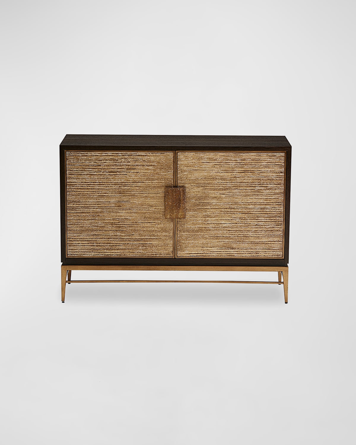 This twodoor cabinet is encased in smoked oak with gold cerusing, and it is mounted on a steel base in antique gold. The doors are inlaid in an antique gold linea oro finish and feature handles with tumbled glass beads Handcrafted of hardwood solids, oak veneers, resin, steel, and gold leaf Single interior compartment with one adjustable shelf European softclosing hinges Overall, approx. 52.25"W x 18.25"D x 36.5"T Weight, 178.0 lbs Imported Boxed weight, approximately 421.0 lbs