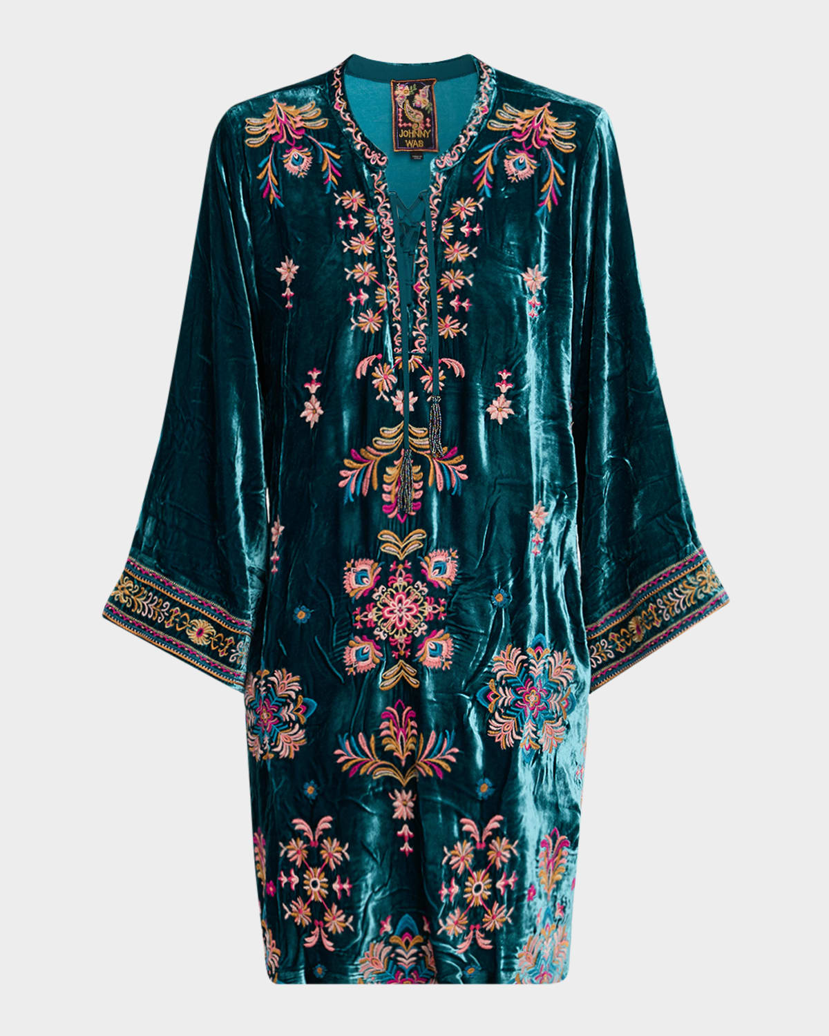 Johnny Was velvet mini dress blooms with bright floral embroidery V neckline Tasseled laceup front selftie 3/4 kimono sleeves Double side slit hem Hem falls above the knee Shift silhouette Slipover style Rayon/cellulose acetate/silk Dry clean Imported