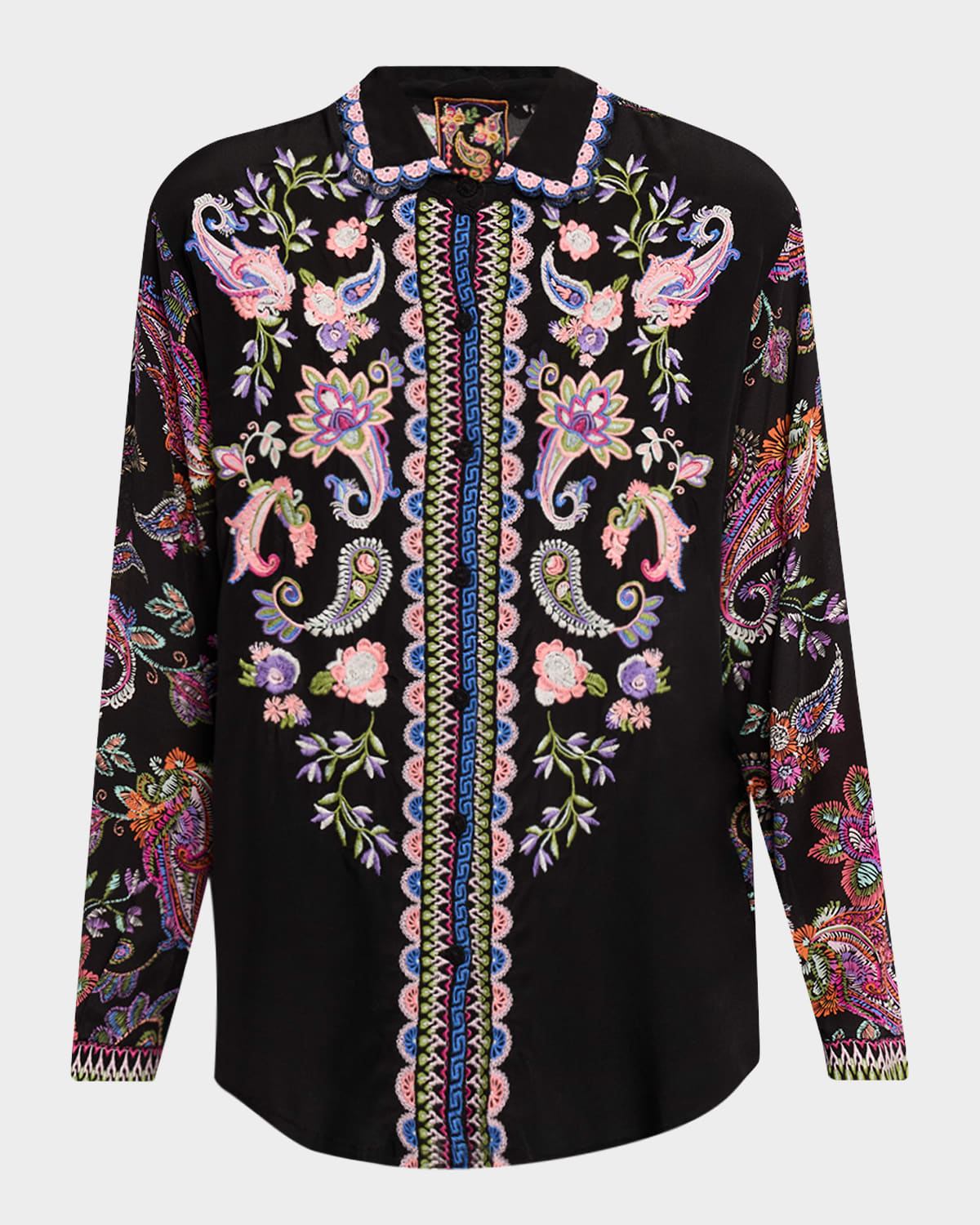 Made of silk georgette, the "Mills" shirt from Johnny Was features a bright, intricate print of paisley swirls and florals Vibrant floral and paisley embroidery adorns the front Spread collar with scalloped trim Button front Long sleeves Button cuffs Relaxed fit Silk Machine wash Imported