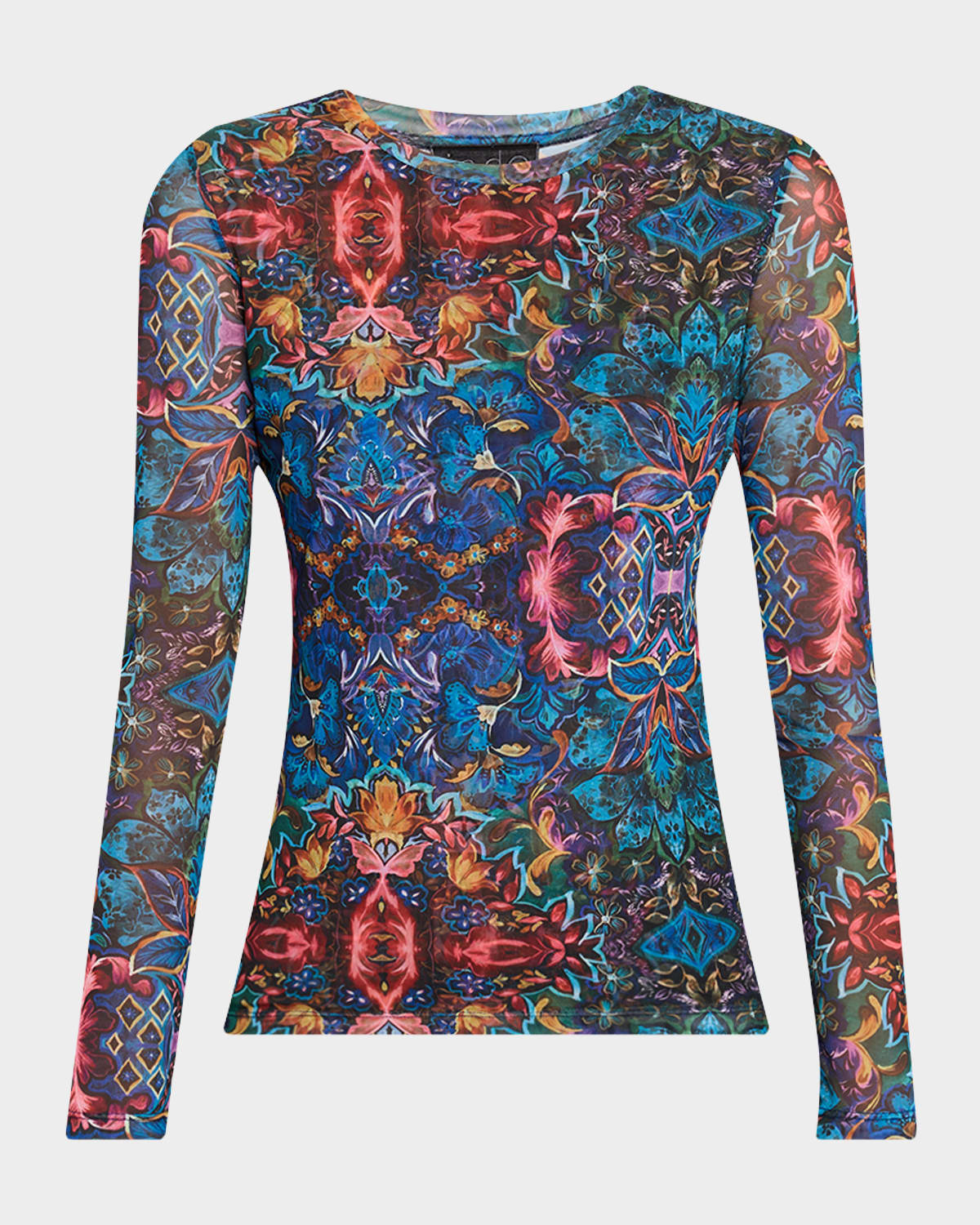 Made of mesh, the "Natalie" tee from Johnny Was features a vibrant kaleidoscope print Crew neckline Long sleeves Relaxed fit Pullover style Polyester/spandex Machine wash Imported