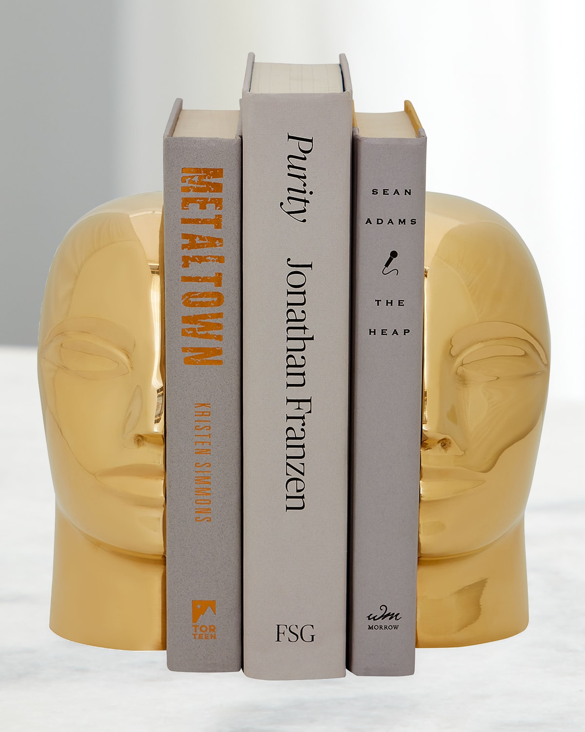 Faceshaped bookends set is crafted of brass and acrylic Approx. 5.3"W x 4"D x 7.3"T each Hardware not included Item Weight (Lbs.): 10.4 Wipe clean Set of two Imported