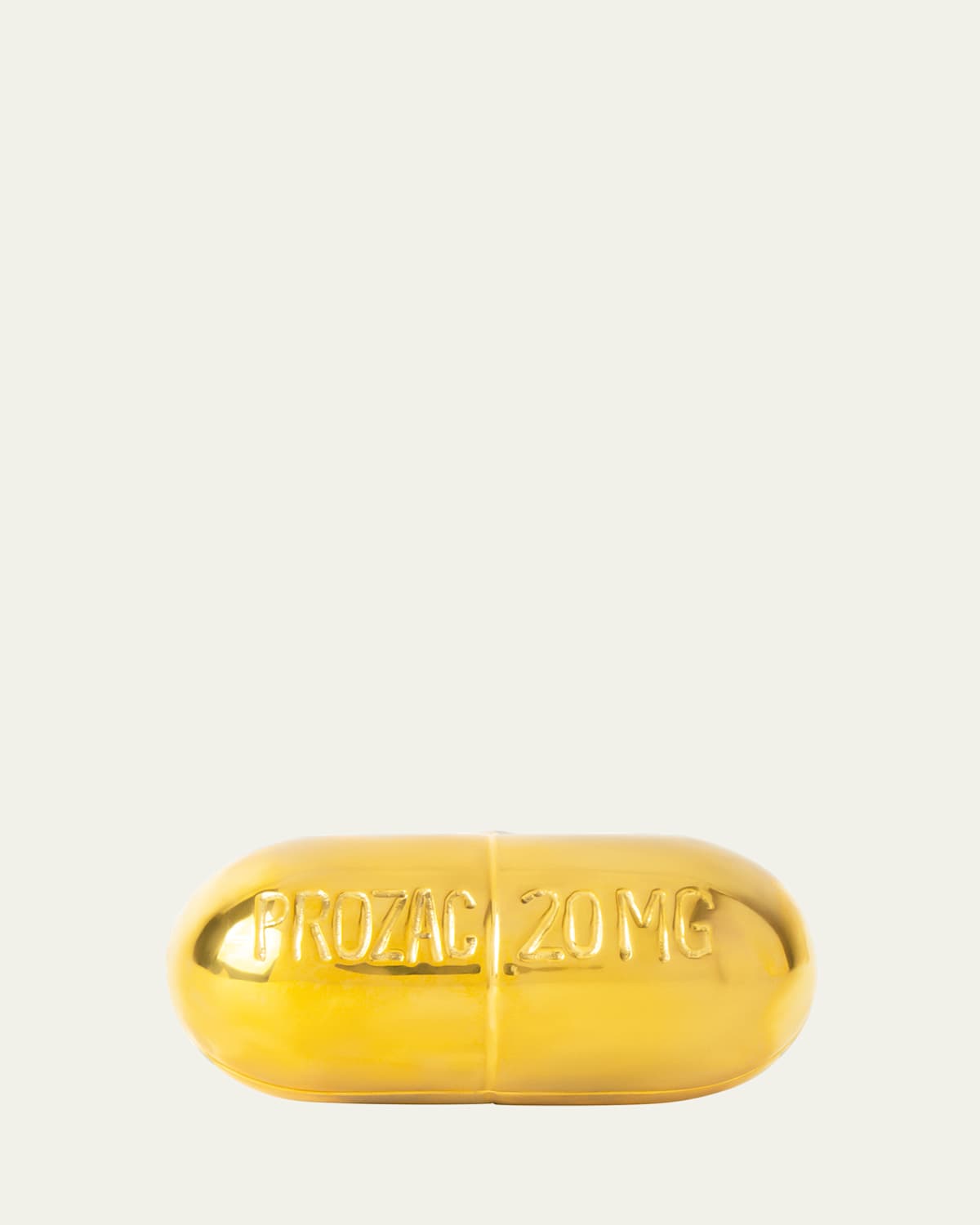 Pillshaped box is made of brass. Laseretched top. Hinge lid. Approx. 5"W x 2.5"D x 3"T. Spot clean. For indoor use only. Imported.