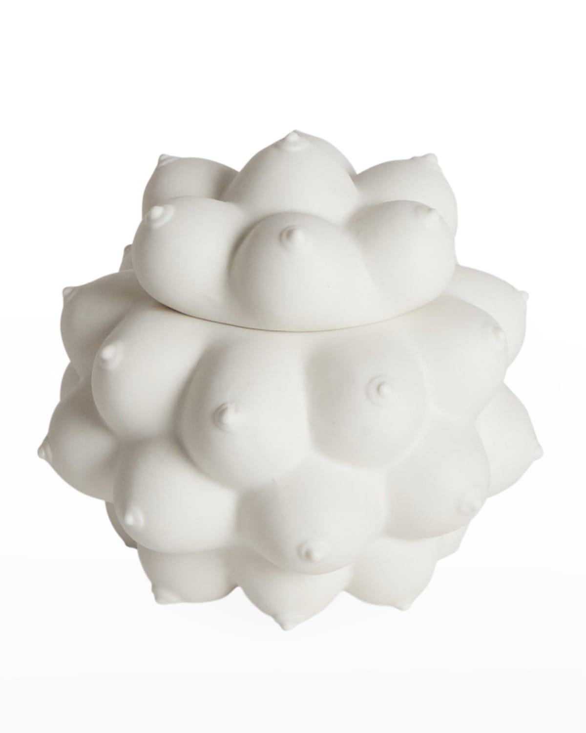 High fired porcelain box. 6"Dia. x 6"T. Dust with a soft, dry cloth. Imported.