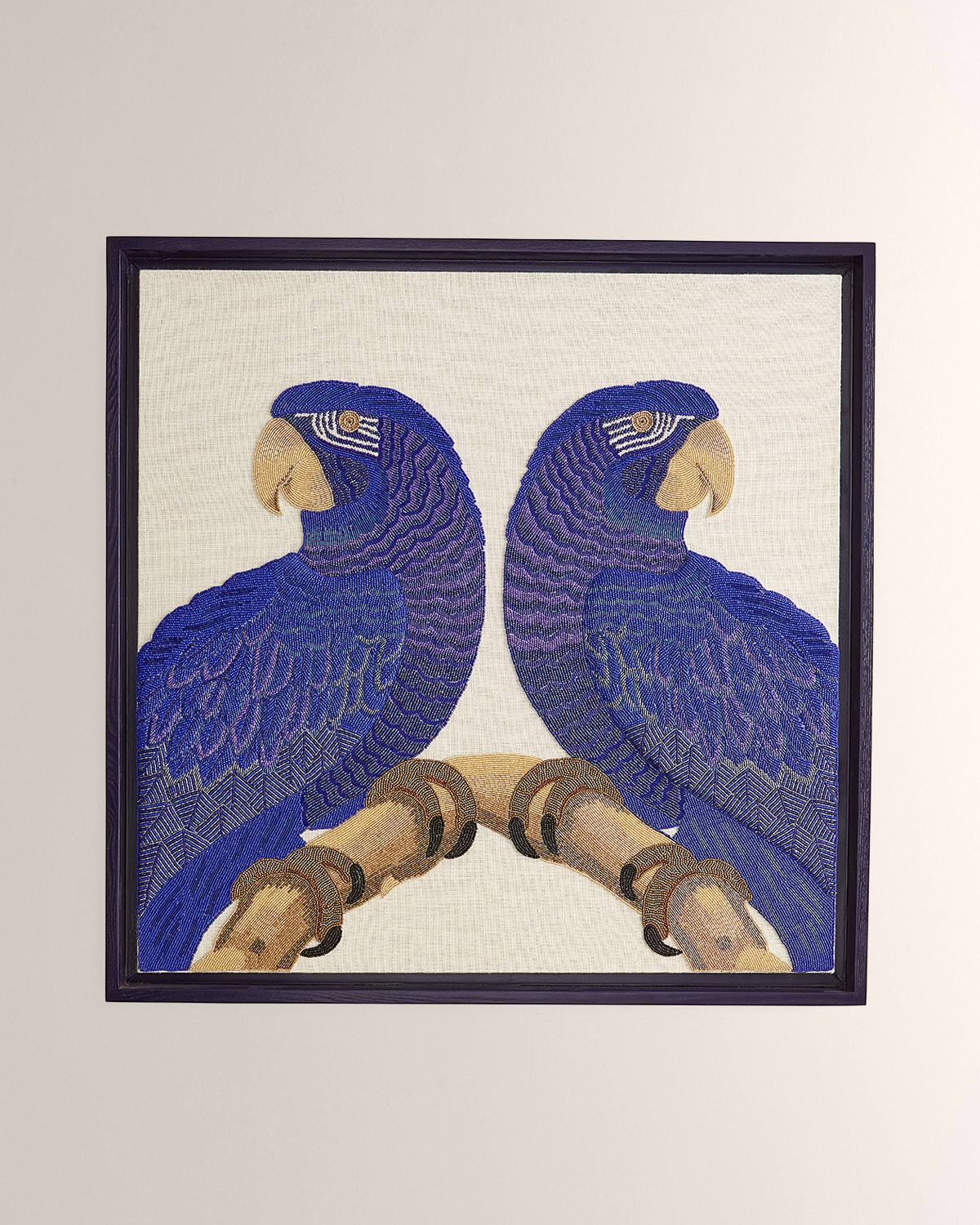 Macaw wall art handcrafted of glass beads on linen comes in a wood frame with a navypainted finish Overall, approx. 30"Sq. x 2"D French cleat hanging hardware on back Hangs vertically Wipe clean Weight, 15.0 lbs Imported Boxed weight, approximately 18.0 lbs