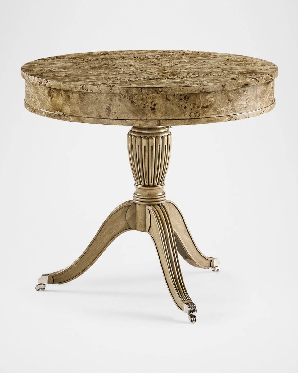 The Fulgurite Drum Table from Jonathan Charles' reimagined portfolio makes an enchanting accent piece for sitting areas and living spaces. A circular hardwood top wrapped in mappa burl veneer is finished in a seductive amber matte, creating a mesmerizing illusion of depth and movement. An elegant base carved in a traditional style balances on three gently sloped legs. Handcrafted of ash burl and veneers Satin brass casters for added versatility Overall, approx. 31"Dia. x 28.25"T Includes hardware Finished back Wipe clean Weight, 75.0 lbs Imported Boxed weight, approximately 83.78 lbs