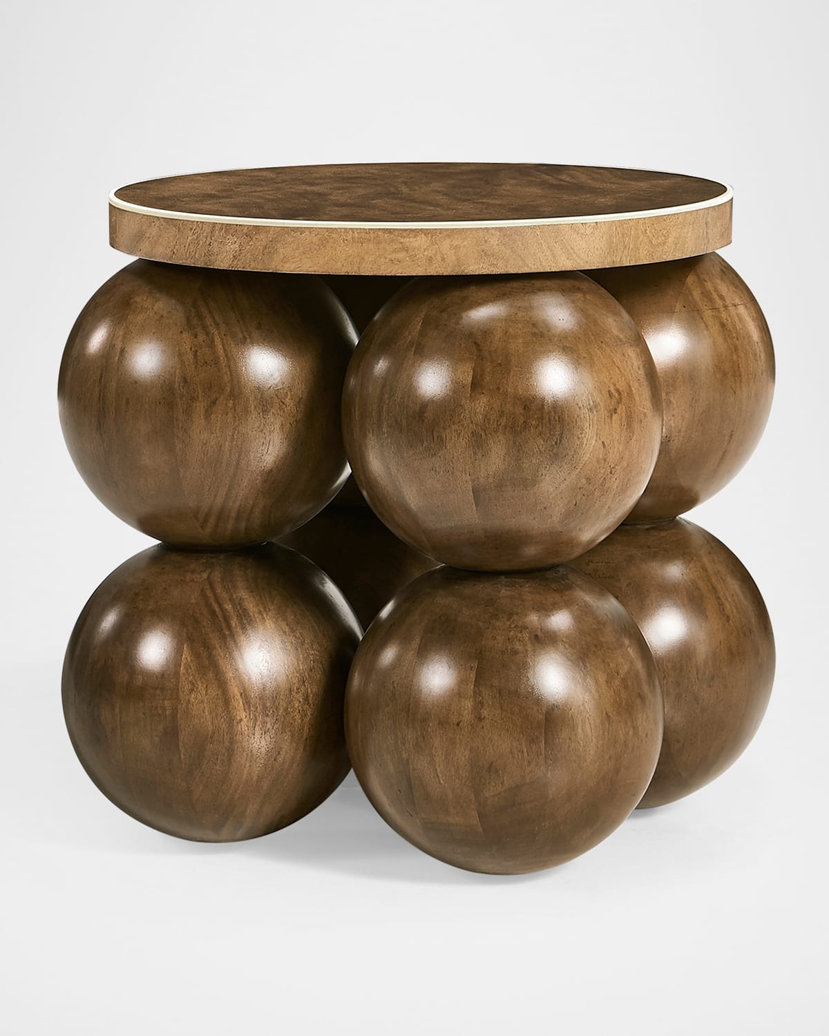 Elevate your home with the perfect imaginative design and contemporary aesthetics through the Orb Accent Table. Its captivating spheres and luxurious finish become the centerpiece that seamlessly combines modern elegance and sophistication. The table's solid woodstacked orbs form a charismatic foundation that fuses art and functionality. These orbs create a unique and eyecatching design that adds personality to the piece. The faux bone inlay creates a subtle visual contrast against the medium brown mahogany veneers, elevating the table's overall appearance. Immerse yourself in the playful side of modern design. Handcrafted of engineered hardwood, mahogany veneer, and polyresin Overall, approx. 18"Dia. x 18.75"T Finished back Wipe clean Weight, 81.5 lbs Imported Boxed weight, approximately 97.44 lbs