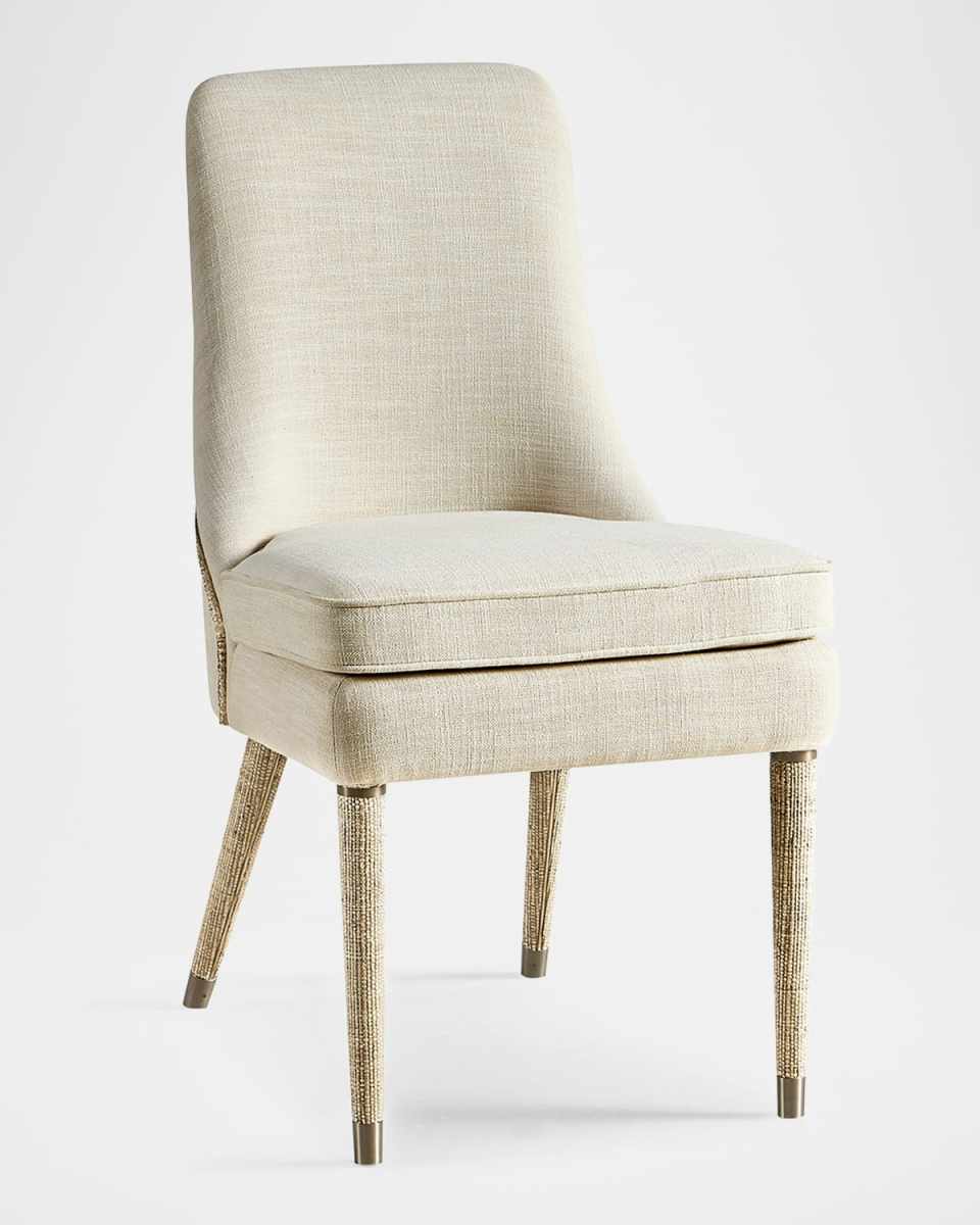 Timeless design, tested durability, and supreme comfort are at the root of Jonathan Charles's Shoal Grasscloth Side Chair. Upholstered in a performance Magnifique fabric with grasscloth welt, this dining chair is supported by stylish legs wrapped in grasscloth with a stainless steel collar and ferrules. This chair is perfect for luxuriating dining experiences in modern tropical interiors. Handcrafted of engineered hardwood, linen, and grasscloth Overall, approx. 18.875"W x 25.25"D x 34.75"T each Seat, 18"W x 20"D x 20.5"T Finished back Spot clean Set of two Weight, 25.0 lbs each Imported Boxed weight, approximately 65.0 lbs