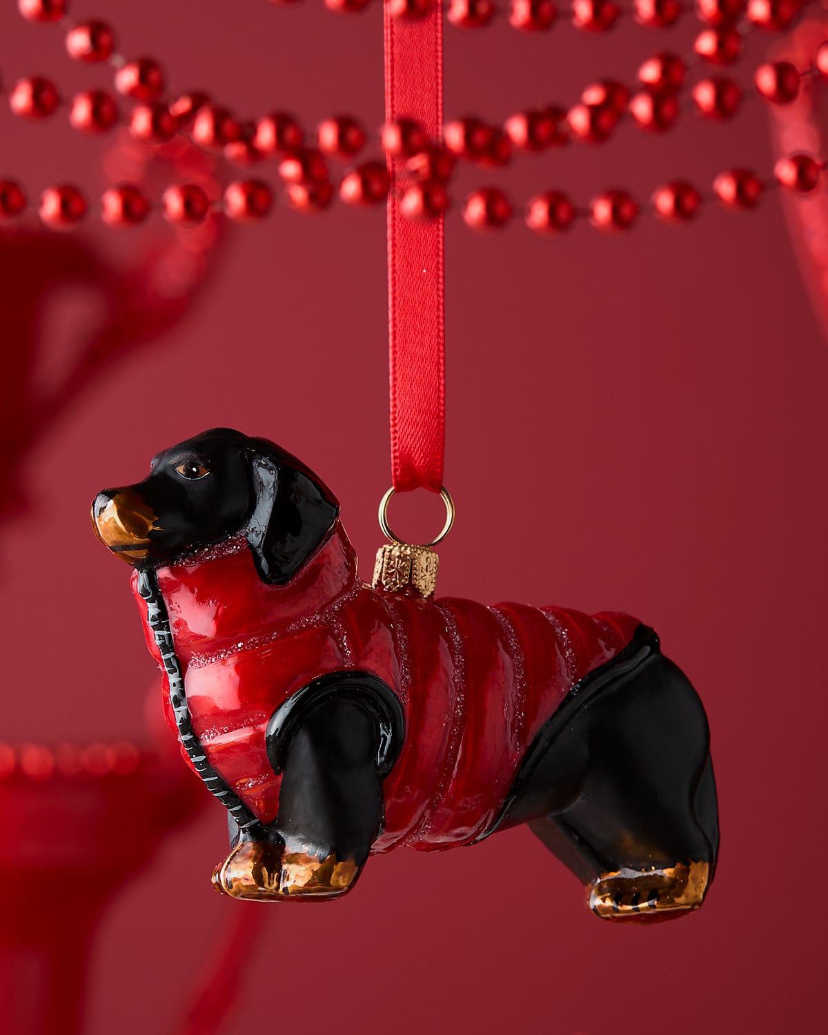 Black Dachshund in puffer coat ornament made from glass and leadfree paint Approx. 3.75"L x 1.3"W Wipe clean Made in Poland
