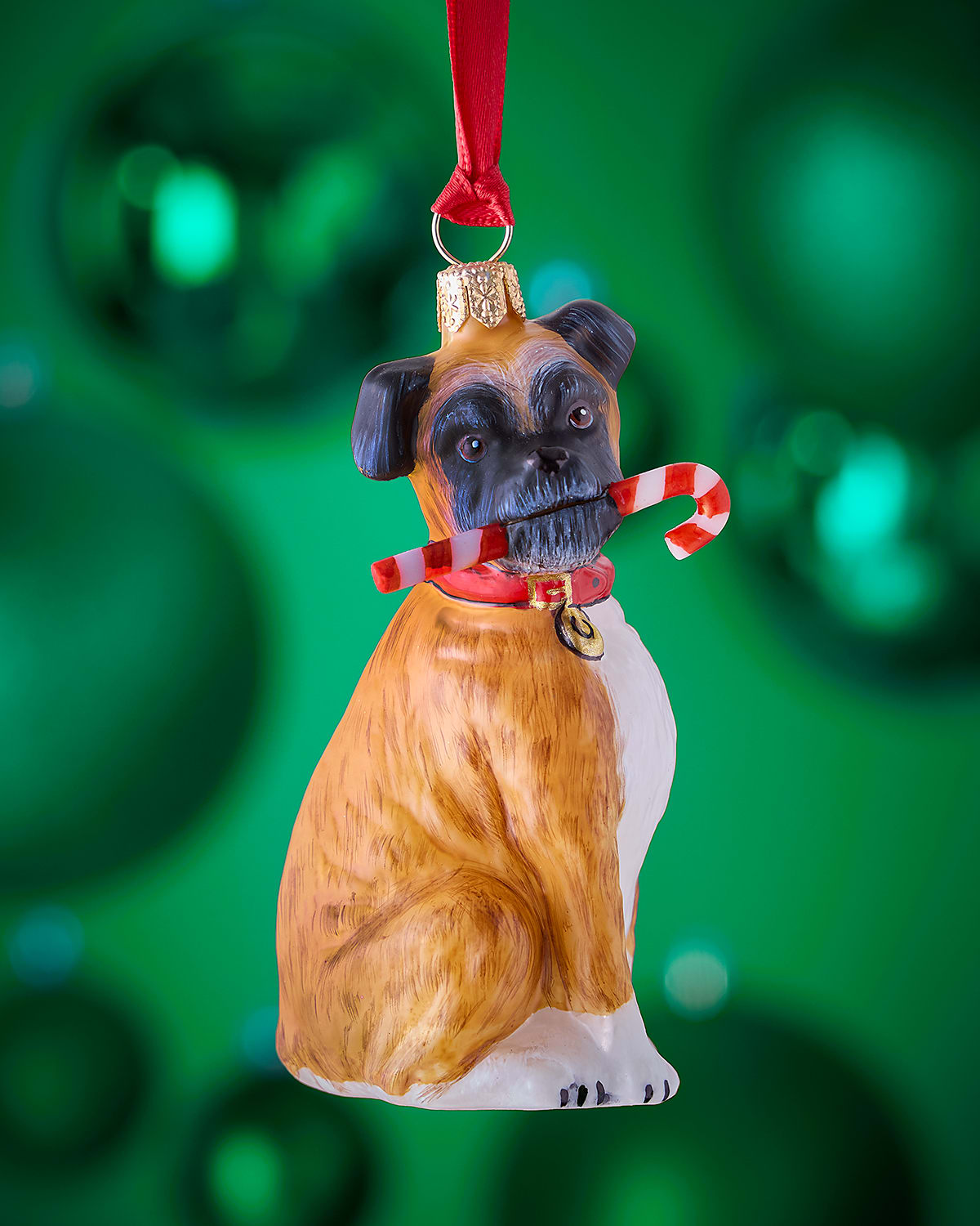 Depicting a Boxer holding a candy cane in its mouth, this Christmas ornament is handmade by some of the finest artisans in Poland using Old World production traditions of individually mouthblowing and handpainting each piece. All materials used in making each ornament are carefully sourced from European countries, and each ornament takes up to 7 days to produce. Handcrafted of glass and leadfree paint Approx. 1.5"L x 2"W x 4"T Wipe clean Made in Poland