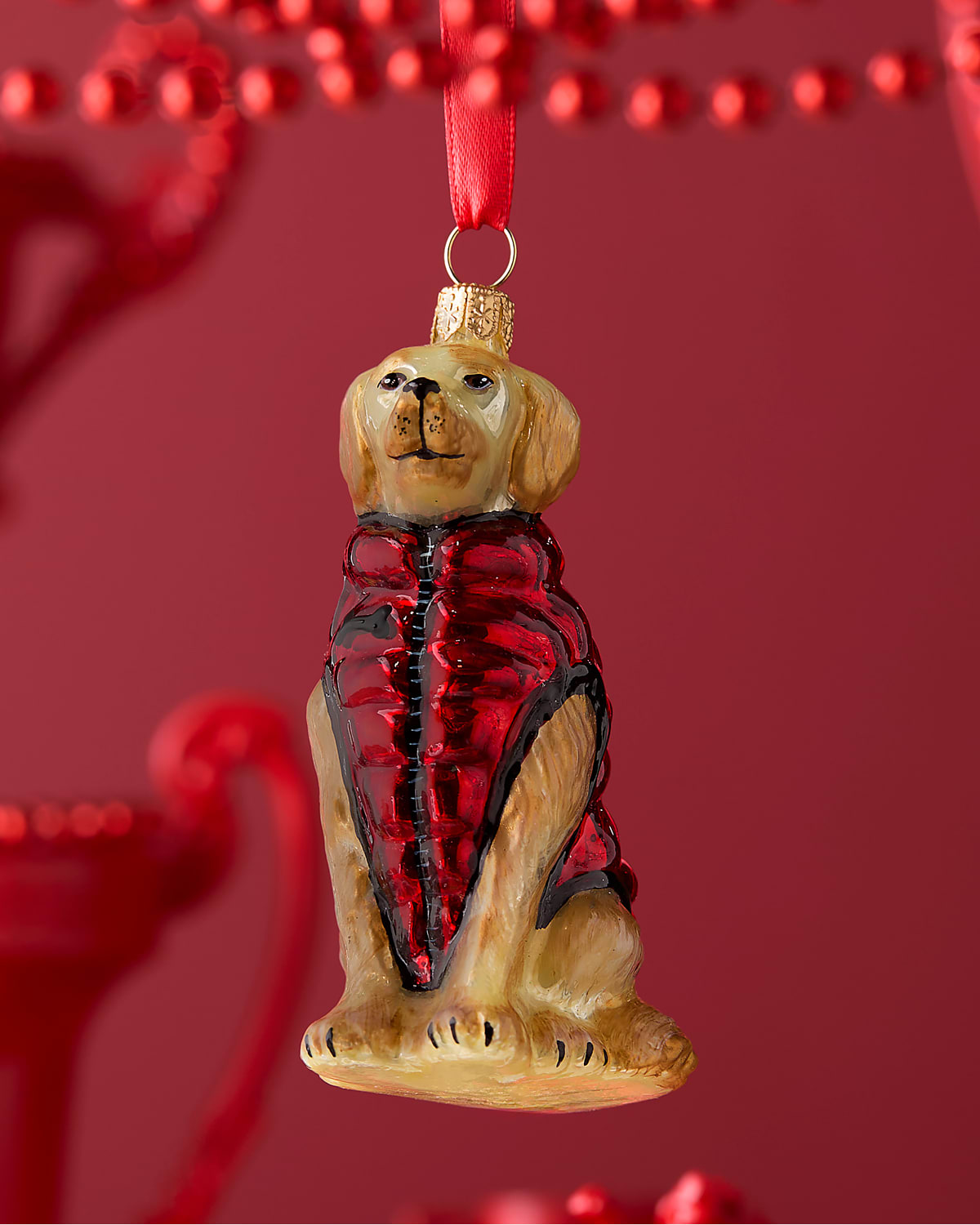 Golden Retriever wearing a puffer coat made from glass and leadfree paint Approx. 1.5"L x 2.3"W Wipe clean Made in Poland