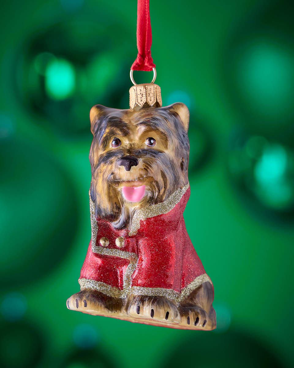 Depicting a Yorkie wearing a peacoat, this Christmas ornament is handmade by some of the finest artisans in Poland using Old World production traditions of individually mouthblowing and handpainting each piece. All materials used in making each ornament are carefully sourced from European countries, and each ornament takes up to 7 days to produce. Handcrafted of glass and leadfree paint Approx. 1.8"L x 2.8"W x 3.3"T Wipe clean Made in Poland