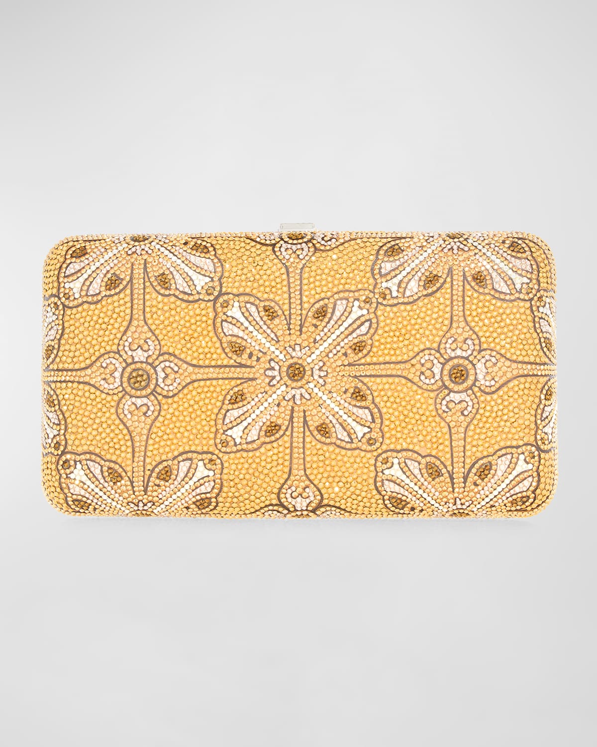Judith Leiber Couture clutch bag in rectangle gilded stamp pattern crystals and zinc alloy Detachable chain shoulder strap, 26"L Can be worn as a clutch or shoulder bag Structured top with liftclasp closure Approx. 4.3"H x 7.5"W x 1.8"D Item Weight (Lbs.): 1.0 Made in Italy