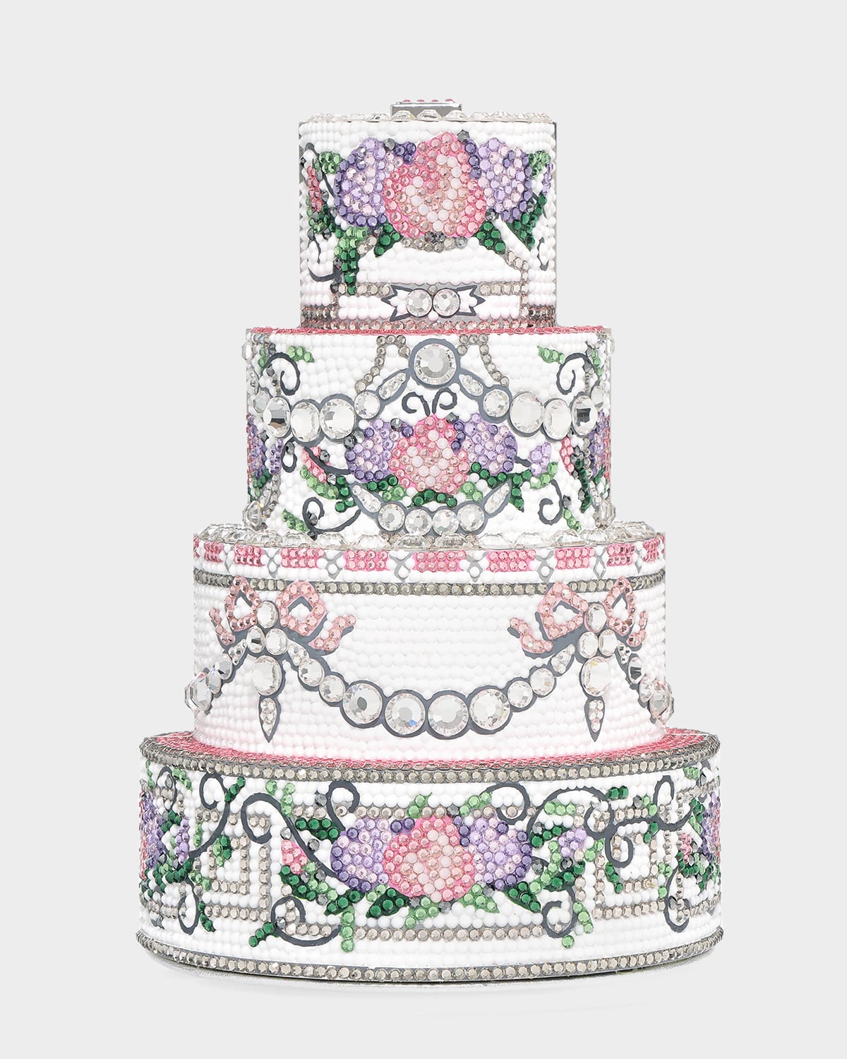Judith Leiber Couture "Tie The Knot" tiered cake clutch bag in crystals and aluminum Detachable chain shoulder strap Can be worn as a clutch or shoulder bag Framed top with pushlock closure Lining: Leather Approx. 6.1"H x 4.3"W x 4.3"D Made in Italy