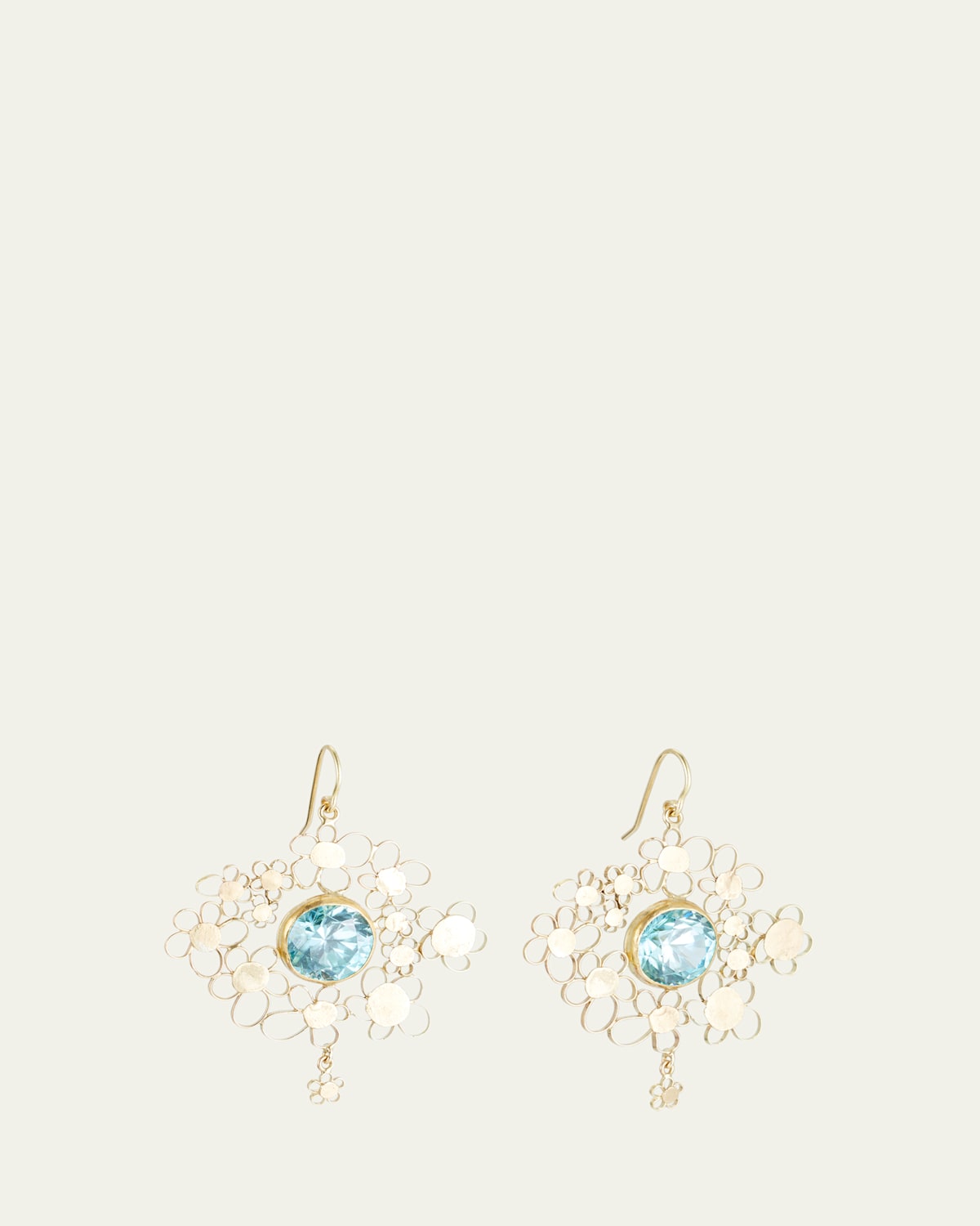 18K Yellow Gold Blue Zircon Flowery Dangle Earrings